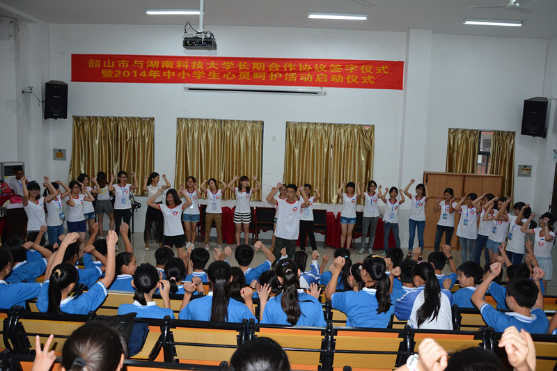 2014年7月4日,湖南太阳成集团tyc122cc入口青少年心灵呵护志愿团赴韶山华润学校开展暑期“三下乡”志愿活动。此次活动应韶山市政府、市政协、市教育局和市团委邀请,旨在帮助韶山市各中小学规避、发现与化解学生的心灵危机,提高其心理健康水平,同时也为志愿者们提供一个良好的德育实践平台。