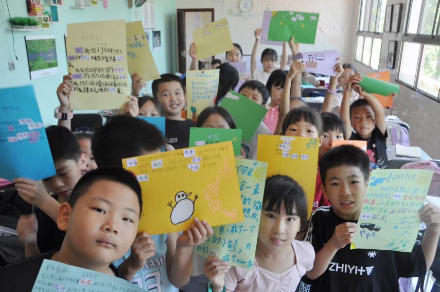 ▲孩子们展示拼贴诗作品
