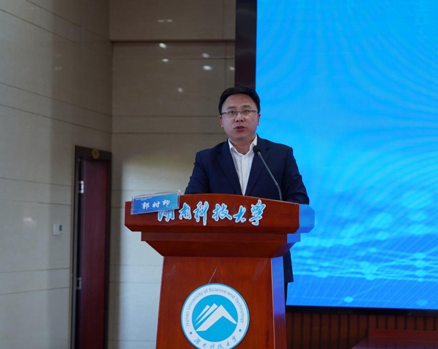 ▲湖南科技大学党委委员、校纪委书记郭时印在成立大会上讲话