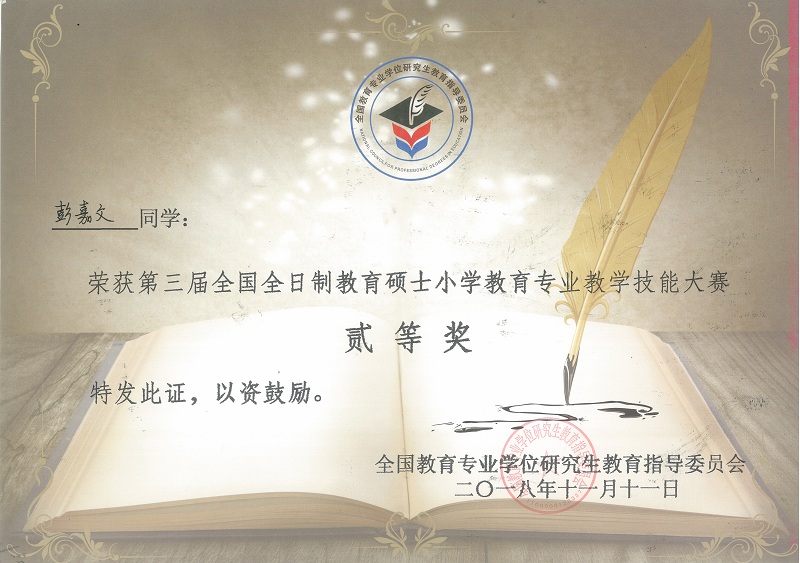 据悉,本次比赛由全国教育专业学位研究生教育指导委员会主办,贵州师范大学承办。来自全国47 所院校、 175名小学教育专业研究生参赛,最终,我院两名学子脱颖而出取得优异成绩。