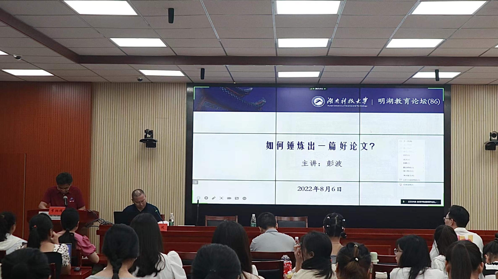8月6日上午,湖南省教育科学研究院《当代教育论坛》主编彭波研究员做客教育学院“明湖教育论坛”(第86讲),在第八教学楼308学术报告厅为我院师生带来了题为《如何锤炼出一篇好论文?》的学术讲座。报告由教育学院党委书记李炳煌主持。