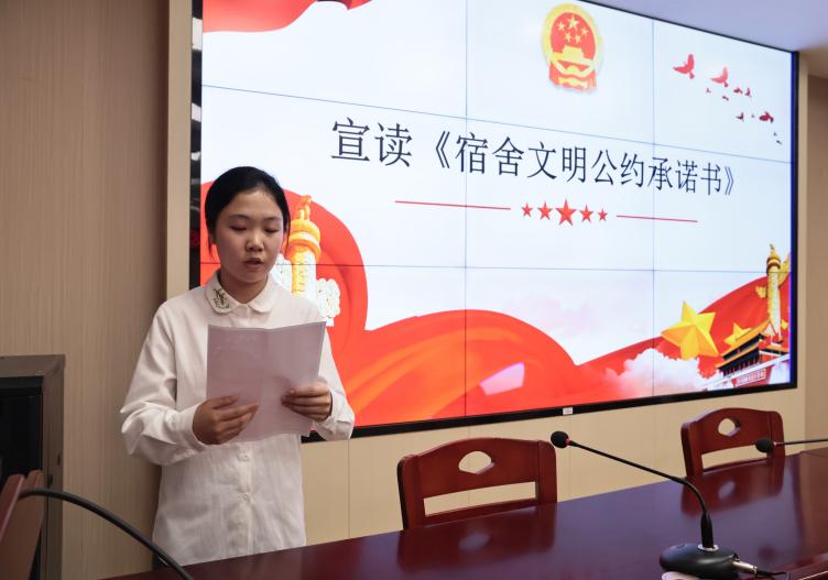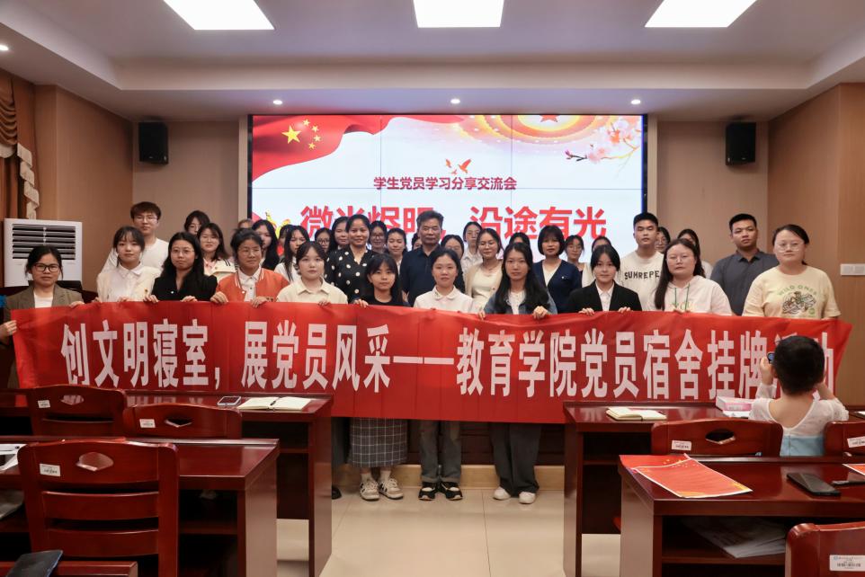 陈薪伊讲述宿舍文化建设心得。学生党员代表喻靖宣读《宿舍文明公约》,学生党员签订《教育学院学生党员〈宿舍文明公约承诺书〉》,文红梅为学生党员宿舍授牌。