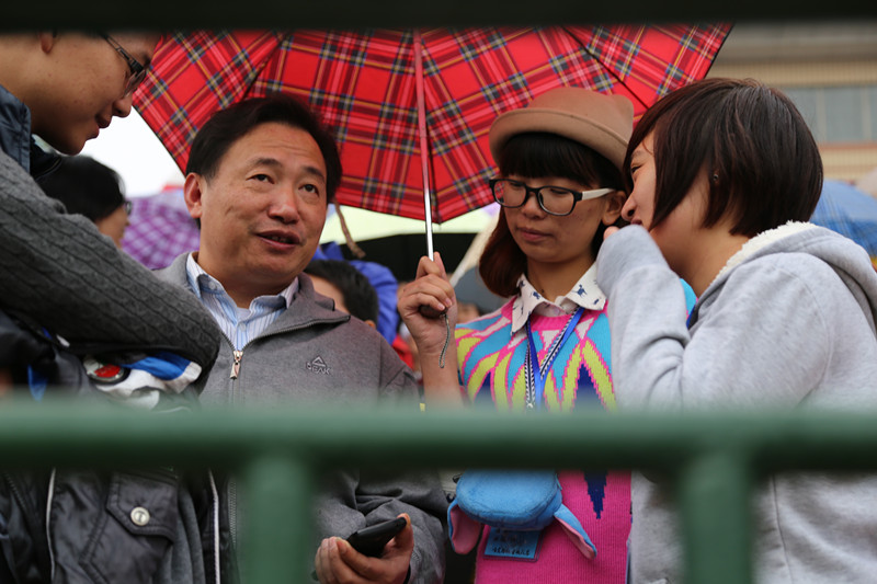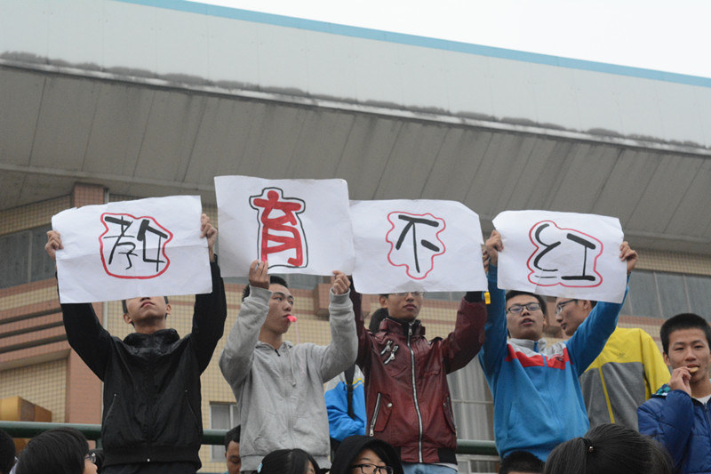 粉嫩的短袖衫,深蓝的牛仔裤,是享受这场运动盛宴的节奏。五星红旗带着蓝色运动会旗在教育学院前飘扬,白色面皮的鼓激荡着雨珠。观众台上三个一群,两个一伙,撑起了五颜六色的伞,雨水淋湿了头发,仍不忘吹响胸前的口哨,为运动健儿呐喊加油。鼓声阵阵,“教育不红,天理不容”的口号响彻着整个赛场——这是粉蓝的教育。学工办老师的亲切问访,书记王伟清的慰问——这是温暖的教育。