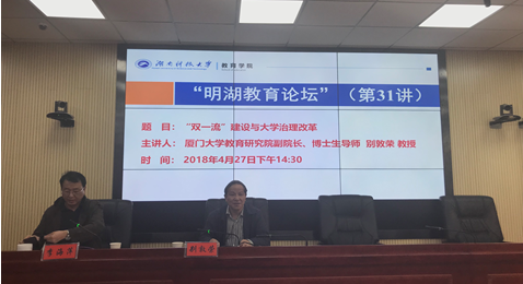 4月27日下午,厦门大学教育研究院副院长别敦荣教授做客“明湖教育论坛”,为我师生作题为《“双一流”建设与大学治理改革》的学术讲座。教育学院教师代表、研究生和部分本科生参加了此次讲座。讲座由教育学院院长李海萍主持。