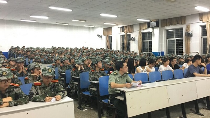 秋风飒爽,丹桂飘香。教育学院2017级新生军训动员大会暨教官见面会于10月1日19时30分在第八教学楼2-3教室隆重举行。莅临该会的领导有教育学院党委副书记刘辉亚,学工办主任李涛。负责教育学院17级新生军训的全体教官,团委学生会主要干部以及近300名本科新生参加会议。大会由学工办主任李涛老师主持。