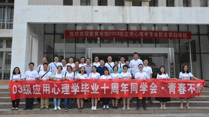 教育学院03级应用心理学专业校友于2017年10月2日荣归母校。校友们通过走进食堂、游览校园、师生畅谈、合影留念、聚餐嗨歌等活动,重拾青春时的美好。那些永远吃不够的美食,那些一起踢球的兄弟,……曾经四年的同窗,愿青春永不散!