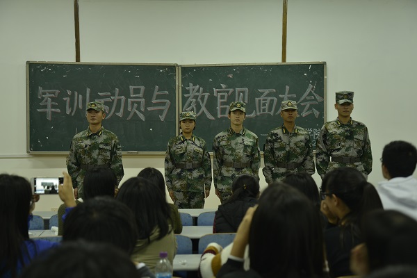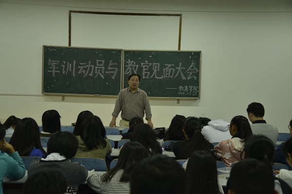 秋风飒爽,丹桂飘香。教育学院2016级新生军训动员大会暨教官见面会于9月29日21时10分在第八教学楼1-3教室隆重举行。莅临该会的领导有教育学院党委副书记王伟清,学工办主任李涛。负责教育学院16级新生军训的全体教官,团委学生会主要干部以及300多名本科新生参加会议。大会由学工办主任李涛老师主持。