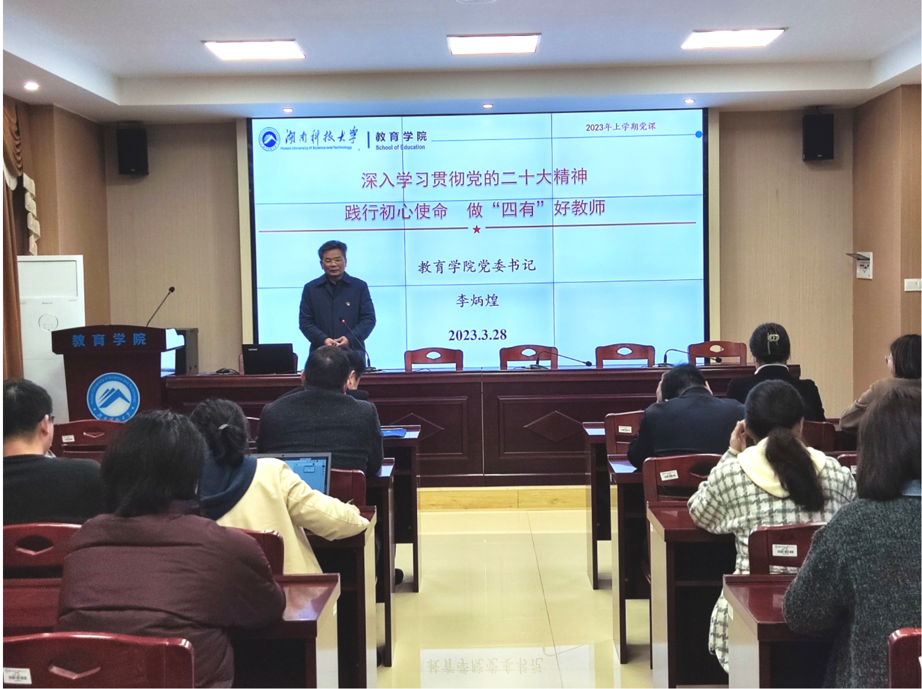 3月28日下午,教育学院“新学期第一堂党课”在敏行楼A333会议室举行。活动分两个阶段进行,第一个阶段由院党委书记李炳煌主讲,全体教职工党员听课;第二个阶段由各党支部书记主讲,支部党员听课。
