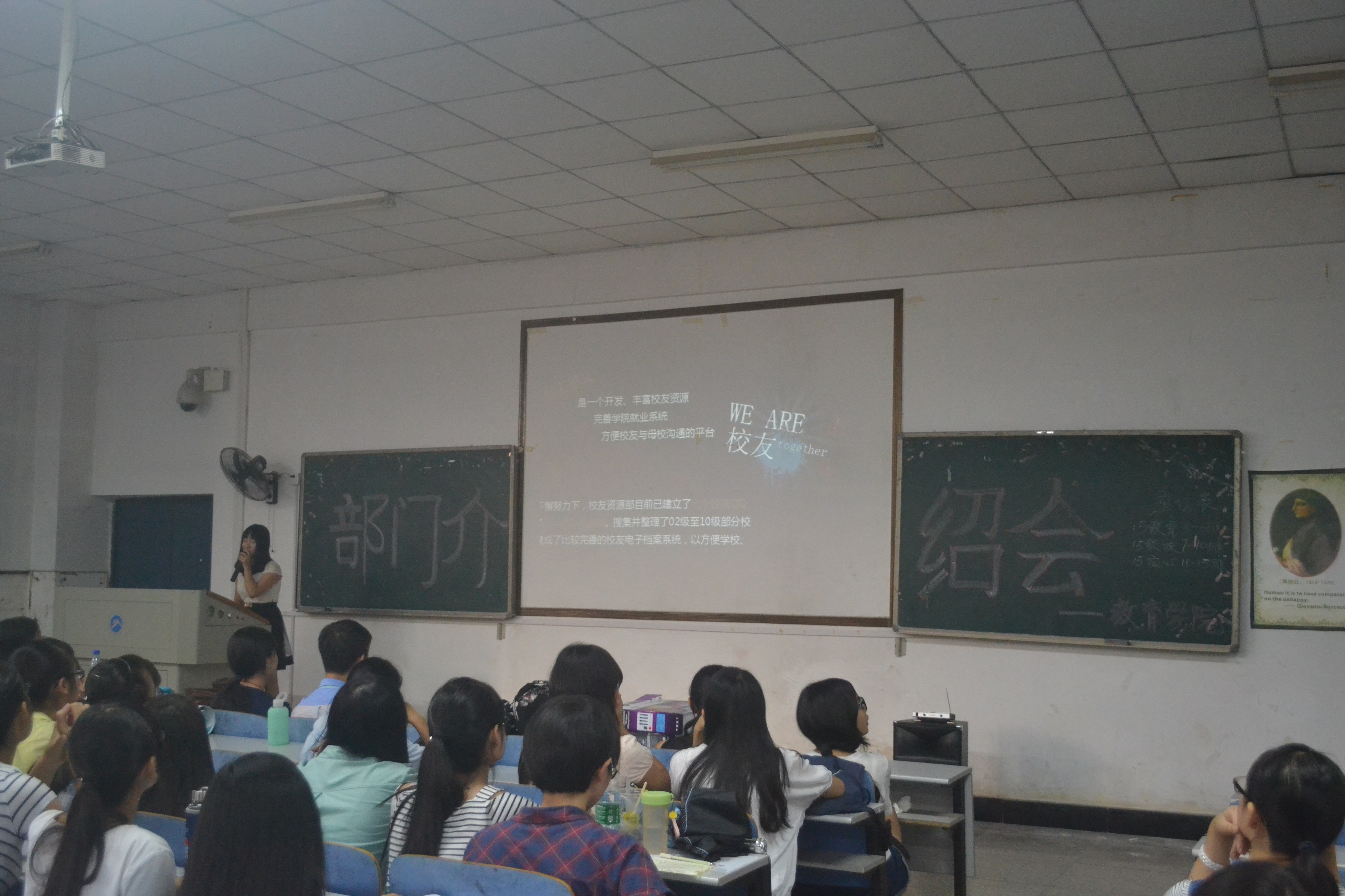 15级新生依序坐定,首发由学生会主席张彤进行第十七届主席团简介,PPT进行结构拆解,内容介绍学工办老师、主席团成员和各部门概况,强调新生选择的“归属感”。而后的党建会在多媒体展示中也在职能组成和成员介绍上进行多面普入。19个部门的轮序演示中,综合管理部以视屏和动画效果解析部门工作职能、日常管理和招新计划;组织考核部以技能型多媒体展示凸显部门优势和工作成果;纪检宿管部大呼“等到你,再出发”,几届“男神”夺人眼球;危机干预部作为“贴心小卫士”在创新,ppt效果展演中也详细介绍了工作性质内容;就业服务部、资助权益部、德育实践部、职业规划部也就大致板块进行分点讲说。广告制作部通过真人展示海报引燃现场热情;体育活动部也放话招新内部福利;校友资源部节奏快而不乱,略而不空;紧接着的学习研究部以“学”而用;文艺活动部以美动人;评估统计部、女生活动部以“活”劲人;网络信息部地气讲说趣得人心;宣传编辑部通过新闻联播形式定概部门性质,不华不话不花但尽文心。对外联络部和科技活动部各尽其力求收“鲜肉”。而在尾接的社团介绍中,木槿感恩支教、沙鸥文学社、心灵呵护志愿团也在主干性质上进行了意赅阐述。时至18时30分,介绍会拉帷结束。