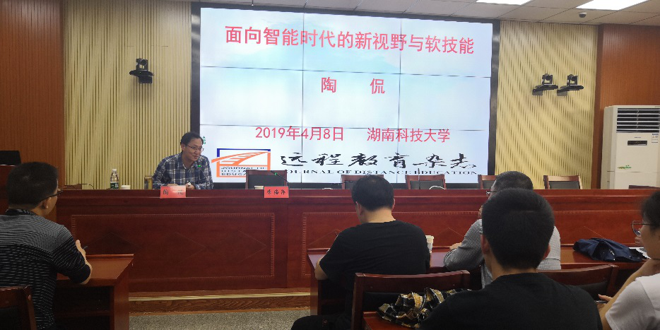 2019年4月8日下午,《远程教育杂志》执行主编陶侃编审做客“明湖教育论坛”,为我院师生带来主题为“面向智能时代的新视野与软技能”的学术报告。报告会由教育学院院长李海萍和教育技术学专业带头人王伟清主持。
