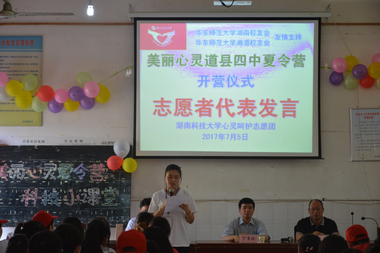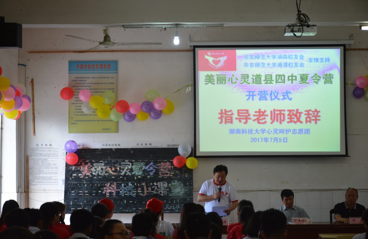 7月5日,上午九时,“湖南科技大学2017年研究生暑期科技服务项目”暨“美丽心灵——道县四中夏令营”正式开营。湖南科技大学留守儿童心灵呵护志愿团指导老师王伟清,道县教育局局长丁有珍,道县四中校长胡仁出席启动仪式,研究生暑期服务队全体成员及道县四中82名学生参加开营仪式。