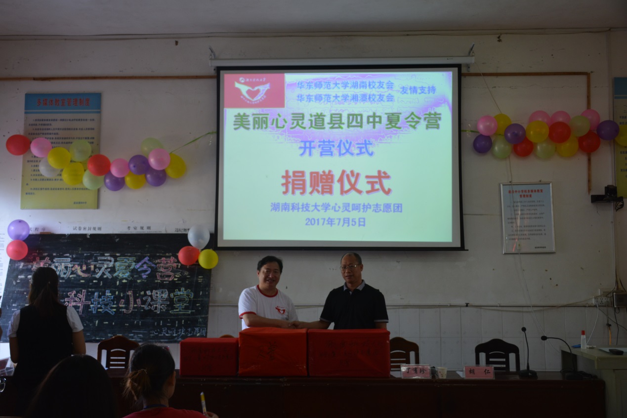 开营仪式最后,湖南科技大学研究生暑期科技服务队向道县四中捐赠价值2000元的学习用品,并举行捐赠仪式。最后,参与开营仪式的全体人员合影留念。