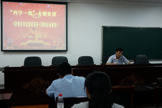 2016年6月21日下午在教育学院408室,校纪委书记刘宇文同志为联系点基层党组织讲“两学一做”专题党课。专题党课由教育学院党委书记谭建平同志主持,校纪委监察处、审计处党支部党员、教育学院党委教职工党员、外国语学院翻译学生党支部党员参加学习。