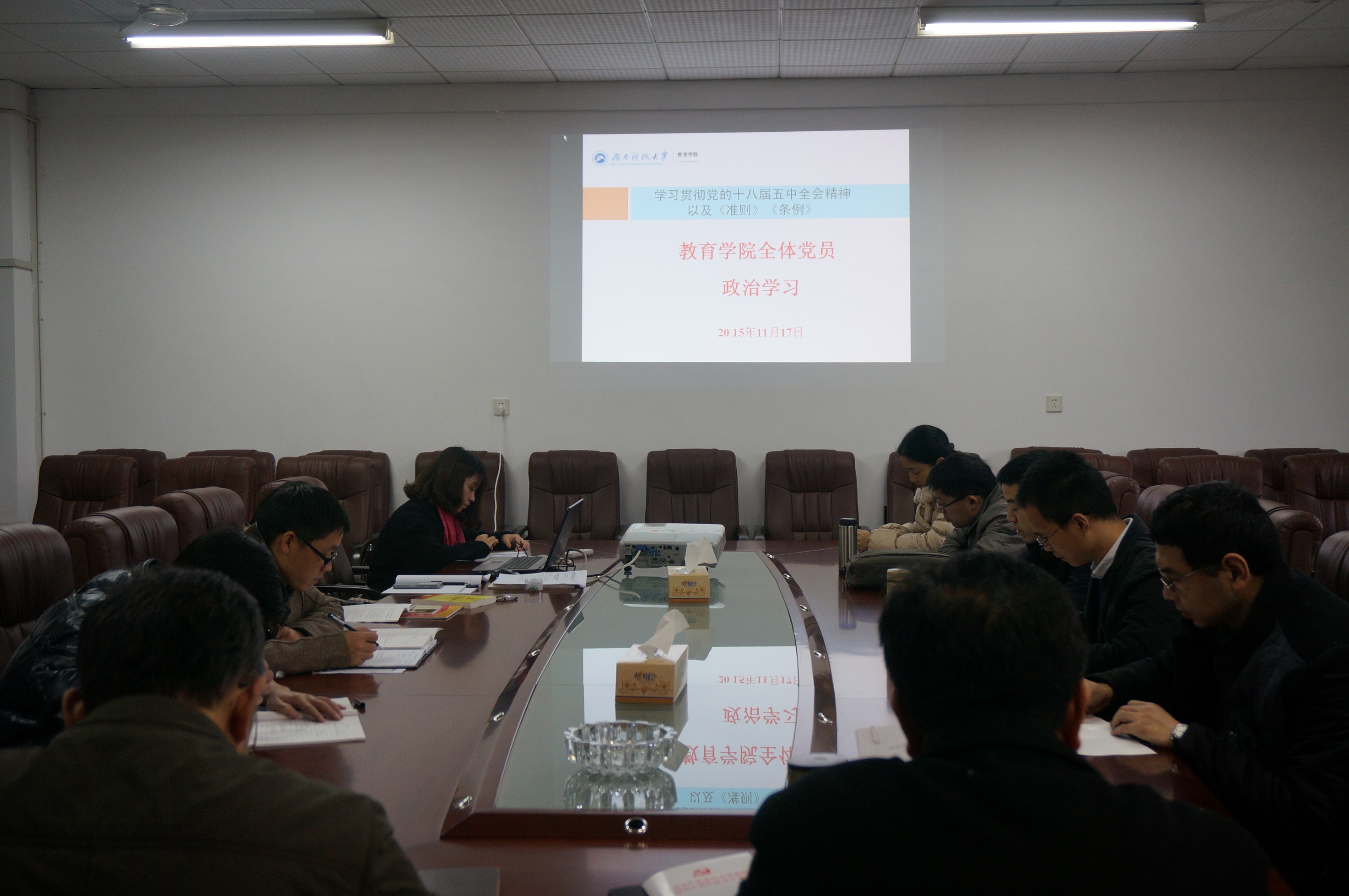 2015年11月17日下午,我院党委在八教203会议室举行了党的十八届五中全会精神以及《中国共产党廉洁自律准则》和《中国共产党纪律处分条例》学习贯彻会。本次政治学习由谭建平书记主讲,学院全体党员参加了学习。