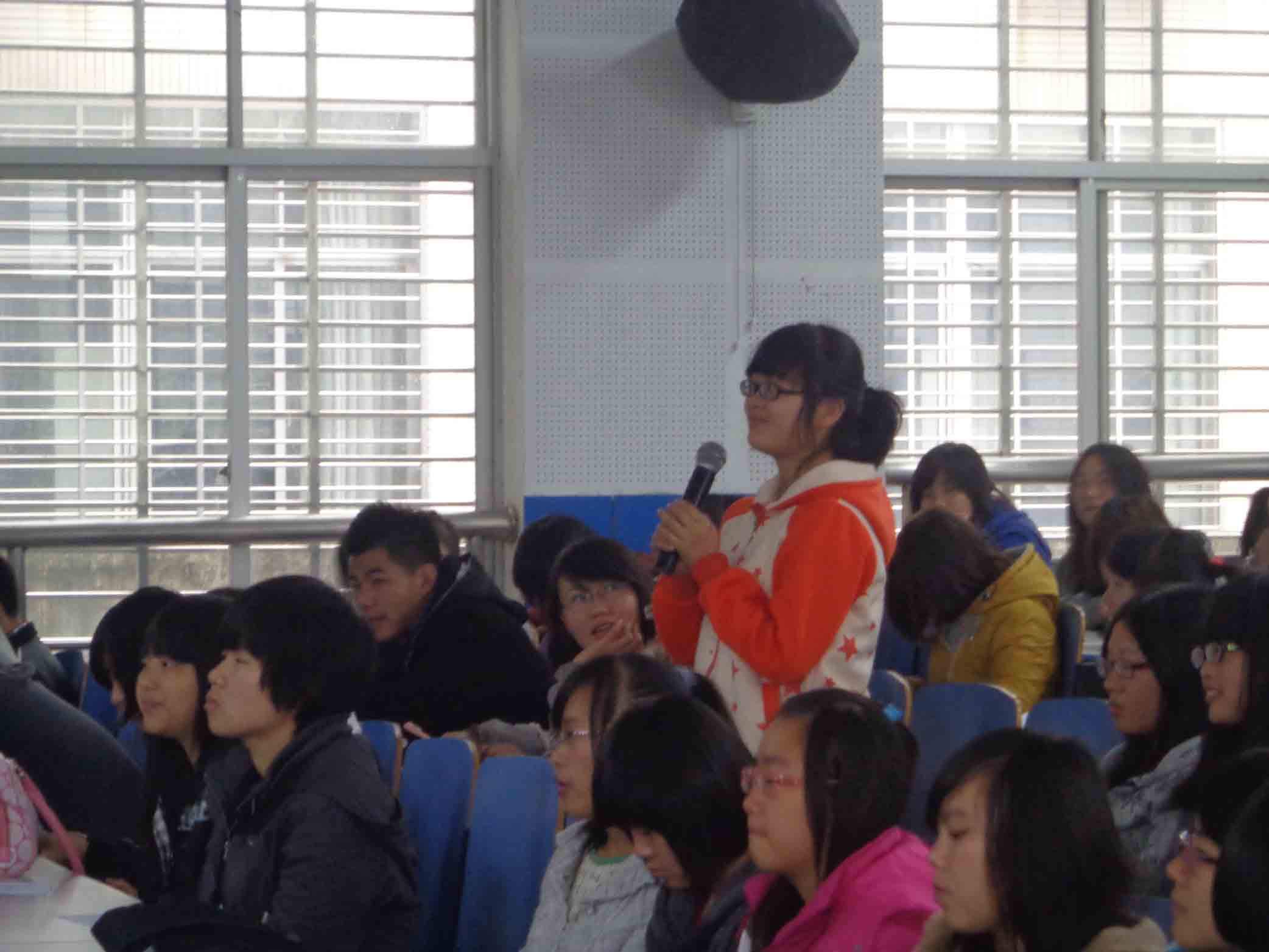 刘阳老师的得意门生雷雯同学则以轻松欢快的语言讲述了其在“挑战杯”大赛中的经历,调动了全场的氛围,以调研的形式让同学们了解到科技创新给生活带来的各种积极向上的影响,鼓励在场每位同学积极参加科技类活动赛事,并且表示:“如果大家对‘挑战杯’还有什么不懂的,欢迎咨询。”