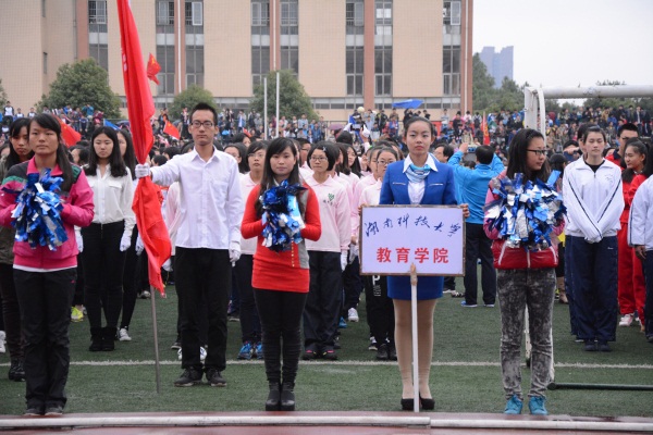 开幕式伊始,整齐的国旗班正步入场,铿锵的步伐走过主席台,迈向国旗台。首先,主持人介绍莅临开幕式各位领导,老师等。接着,运动员及体育学院裁判员组成代表团入场,他们挥舞的彩旗飘扬,振奋人心。接下来各个学院组成的代表团陆续入场。能源与安全工程学院身着红色队服,秉承敢闯敢拼,青春似火,超越自我的能源精神,昂首挺胸走过主席台;接下来是亮眼的土木学院特色的军训服;蓝红色队服的机电工程学院、红白服装的信息与电气工程学院、亮眼的黄蓝队服的化学化工学院、象征内涵深沉的深蓝色队服的数学学院、火红运动服的生命科学学院、黑白相间运动服的建筑物城乡规划学院、外国语学院等也依次入场。别致的粉色上衣,高举“友谊”“快乐”“健康”牌子的教育学院踏着坚定的步伐走过主席台 。商学院、艺术学院、管理学院、法学院、潇湘学院、研究生学院、正装入场的图书馆分工会代表队、机关一分工会、二分工会、三分工会、后勤代表队、附校分工会等各个代表队依次入场。