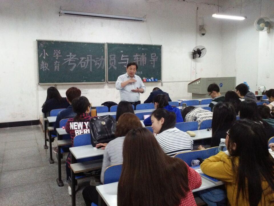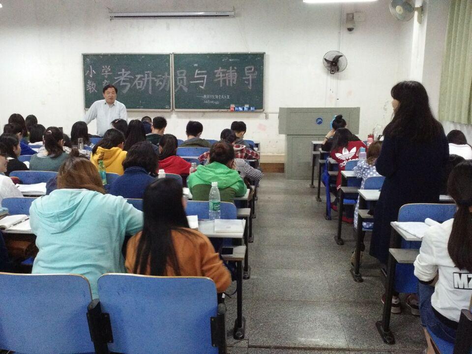 为加强学生对考研知识和经验的了解,营造积极向上的学风,进一步提高我院2013级小学教育专业学生的考研热情,了解更多的考研信息,由教育学院学习研究部主办的13小教考研动员辅导大会于2016年4月20日14点在第八教学楼1-6教室举行,此次大会诚邀我院党委副书记王伟清和学工办主任李涛以及13级辅导员胡银华老师出席。