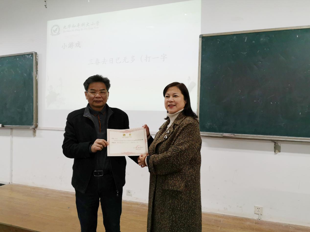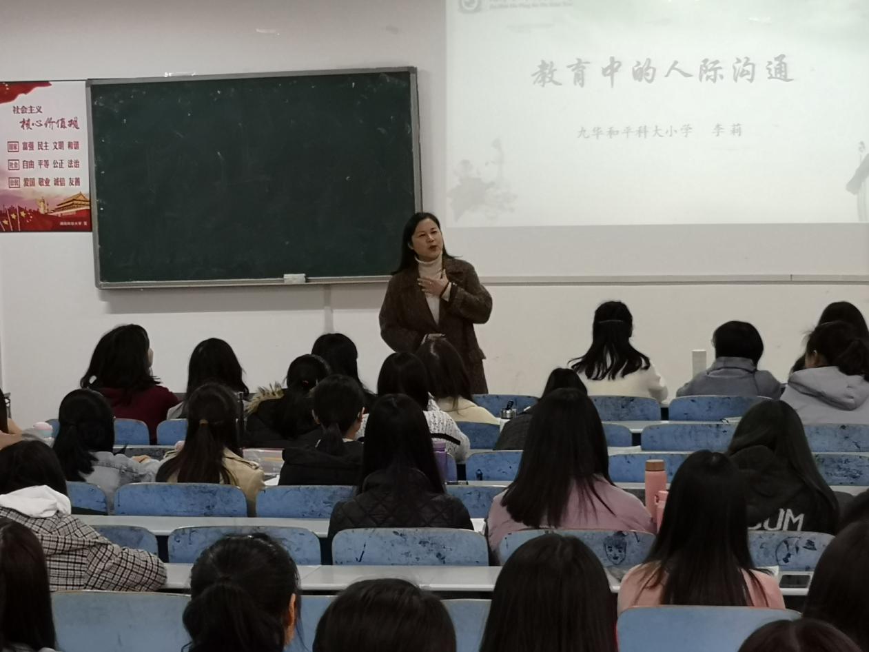 2019年12月6日上午,应学院邀请,国家级骨干教师、湖南省首届教学名师、湘潭市专业技术骨干人才、湘潭市小学语文教学研究会理事长、湘潭市小学语文学科带头人、湘潭市九华和平科大小学李莉校长莅临“躬行讲堂”,为2018级小学教育专业本科生作《教育中的人际沟通》讲座,院党委书记李炳煌主持。