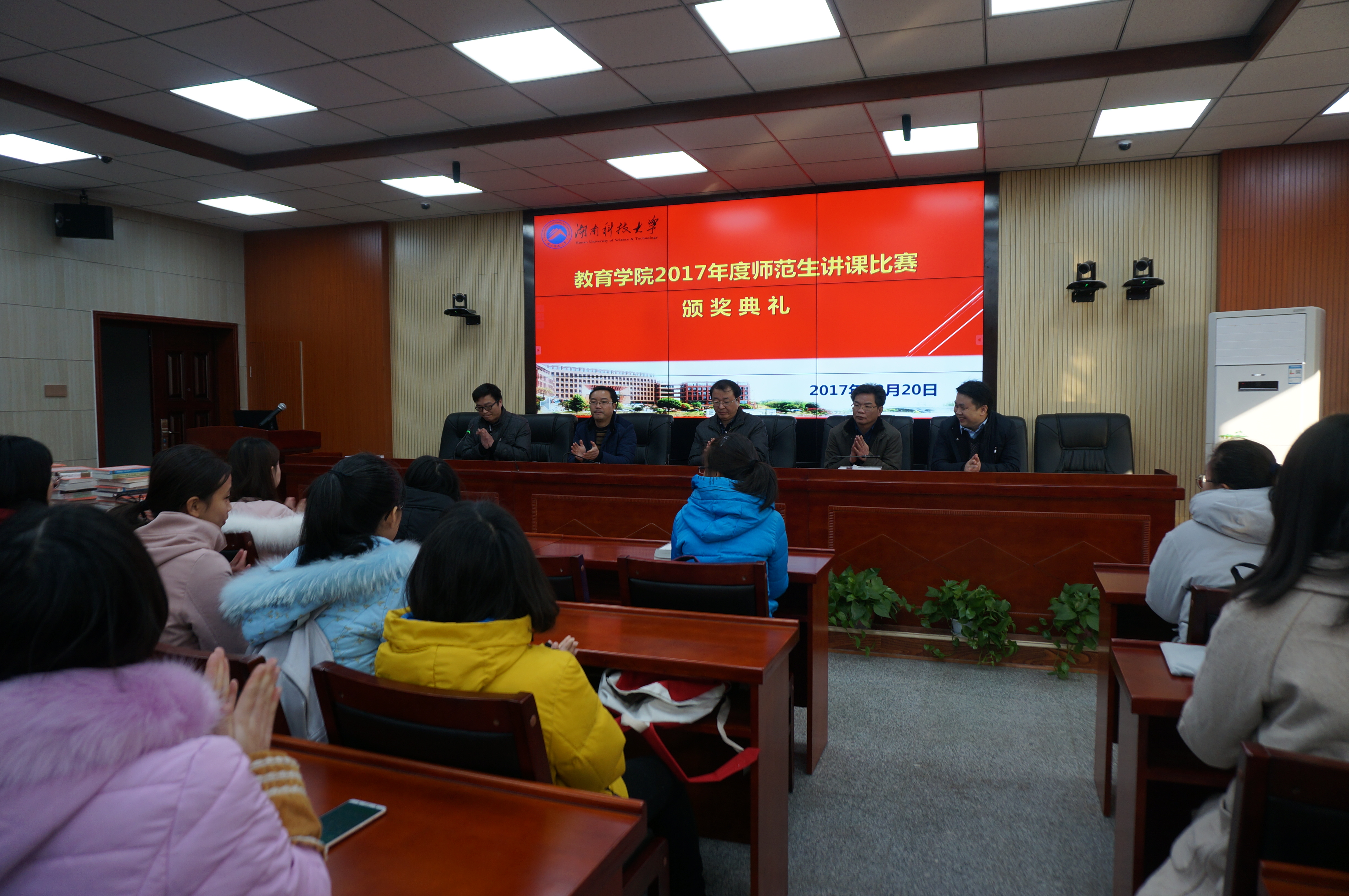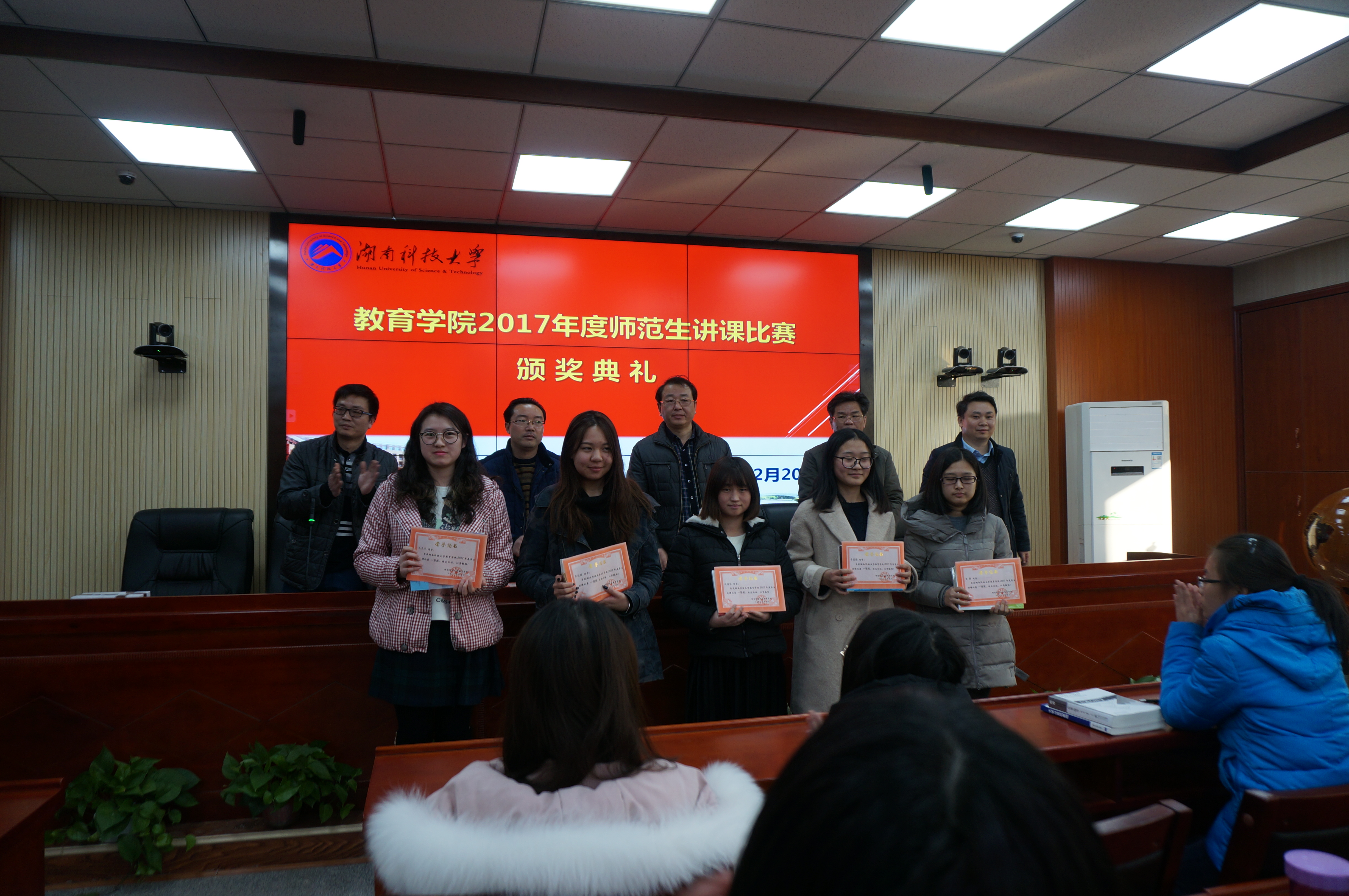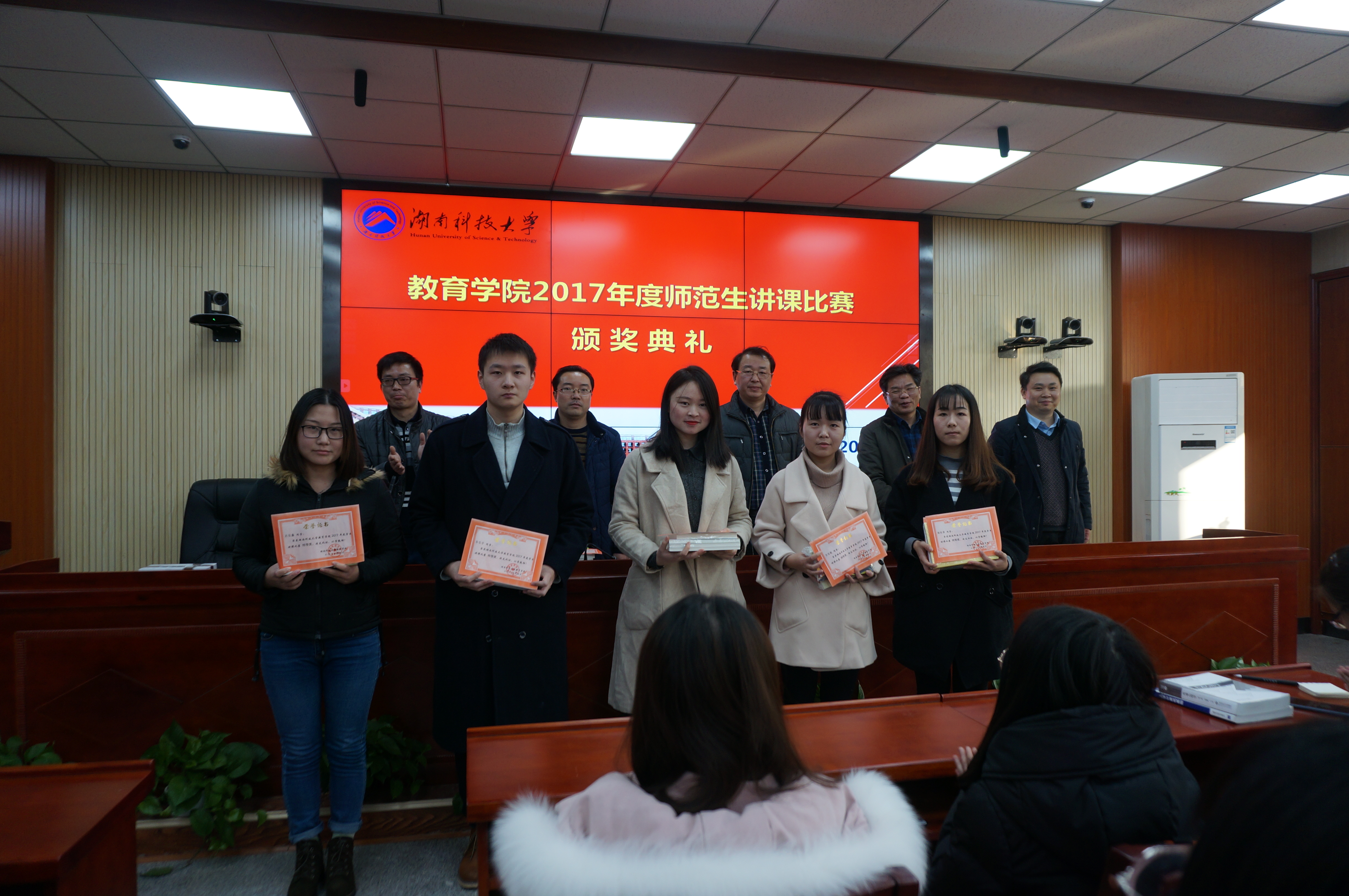 12月20日下午15:30,在第八教学楼308会议室举行了教育学院2017年师范生讲课比赛颁奖典礼。院长李海萍教授、院党委书记李炳煌教授、副院长谭千保副教授、党委副书记刘辉亚出席,典礼由心理学系主任陈京军副教授主持,学院部分学生参加了此次颁奖典礼。
