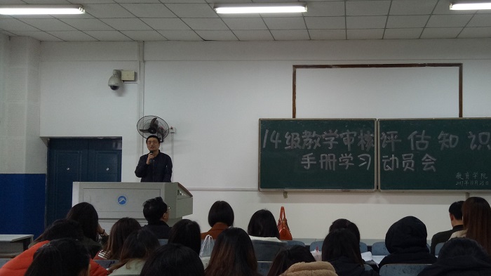 教育学院党委副书记刘辉亚以及各年级辅导员们主持召开2014-2017级评估动员大会,他们围绕本科教学工作审核评估内涵、审核评估时间、指导思想、考察重点等方面的内容,给学生讲解了评估工作,让学生了解本科教学审核评估的意义,为迎接审核评估工作做好基础保障。同学们纷纷表示会加强课堂自我管理,提升学习效率;拒绝校园不文明行为,提升文明素养;参与早晚自习,营造学习氛围。