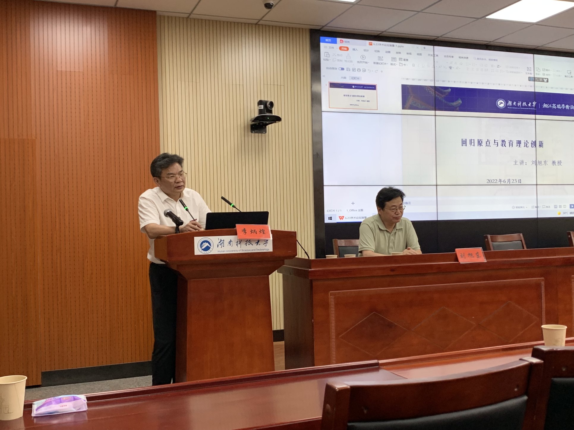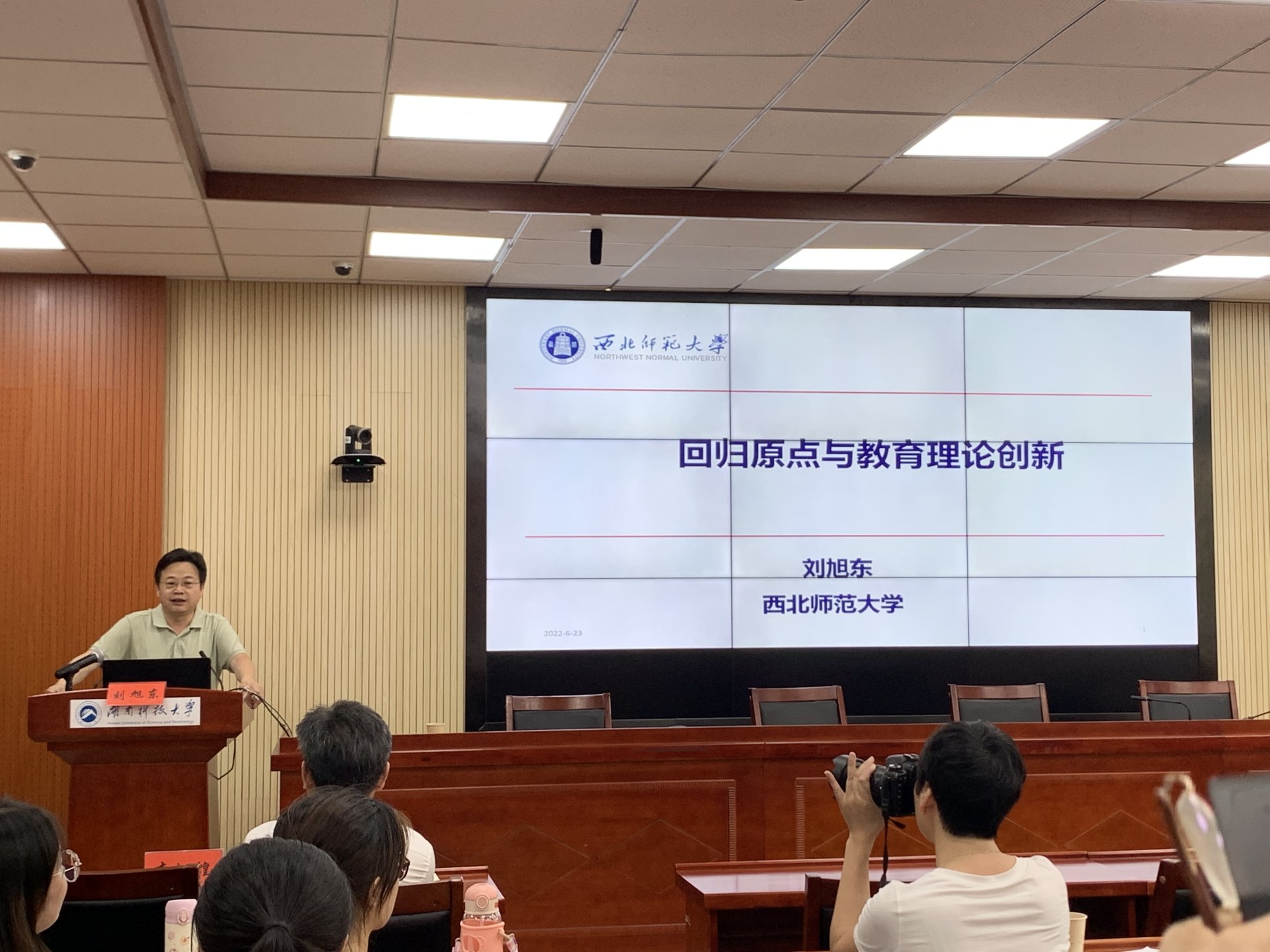 6月23日下午,西北师范大学博士生导师、全国教育专业学位研究生教育指导委员会委员刘旭东教授做客“湘江高端学术论坛” 暨教育学院“明湖教育论坛”(第84讲),在第八教学楼308学术报告厅为我校师生带来了题为《回归原点与教育理论创新》的学术讲座。我校教师、研究生和本科生代表到场聆听。报告由副校长王卫军主持,教育学院党委书记李炳煌总结。