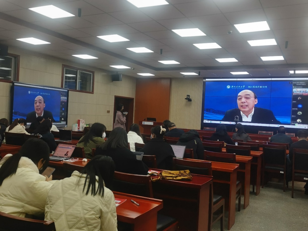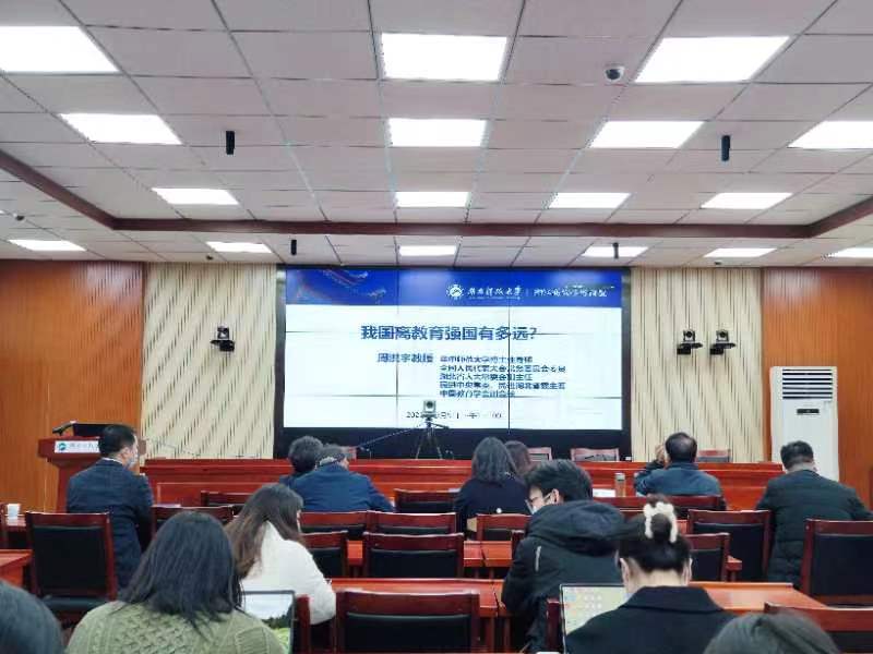 12月9日下午,全国人民代表大会常务委员会委员、中国教育学会副会长、湖北省人大常委副主任、民进中央常委、民进湖北省委主委、华中师范大学国家教育治理研究院院长、博士生导师周洪宇教授做客“湘江高端学术论坛”暨教育学院“明湖教育论坛”(第88讲),在第八教学楼308学术报告厅以线上线下相结合的方式为我校师生带来了题为《我国离教育强国有多远?》的学术讲座。教育学院(教育科学研究院)师生代表、民进湖南科技大学支部会员代表参会。校党委委员、副校长谢慧主持并总结。