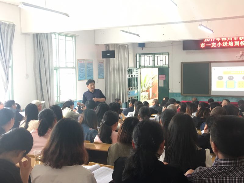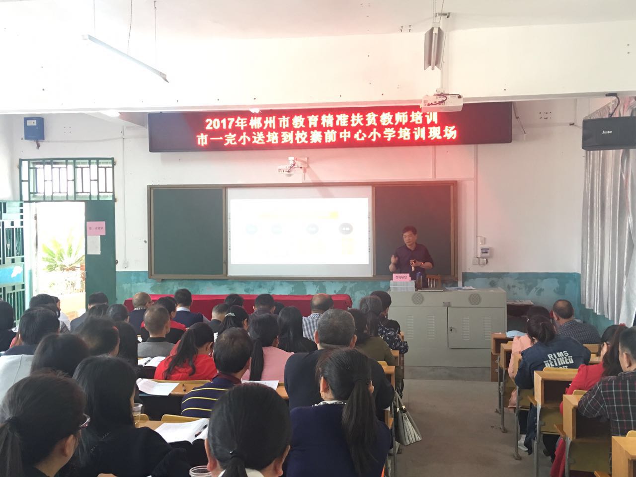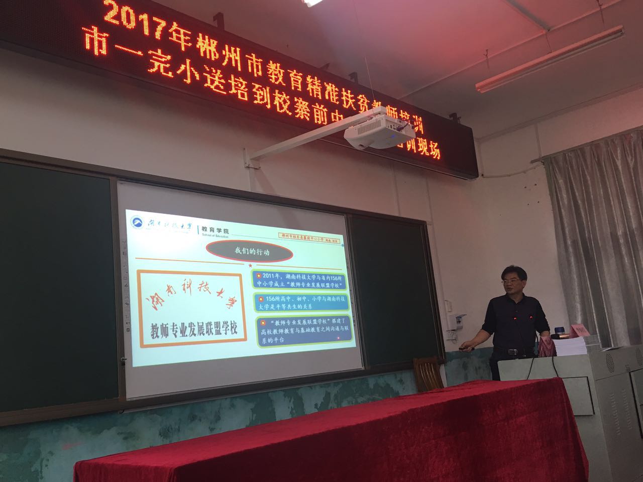 为贯彻落实教育部《教育脱贫攻坚“十三五”规划》精神,应郴州市教育精准扶贫教师培训项目邀请,我院积极支持郴州市“送培到校”教育精准扶贫教师培训。2017年5月6日-7日,院党委书记李炳煌教授赴郴州市桂东县寨前中心小学进行教育扶贫,并作《农村中小学教师专业发展与教研能力提升》专题报告。