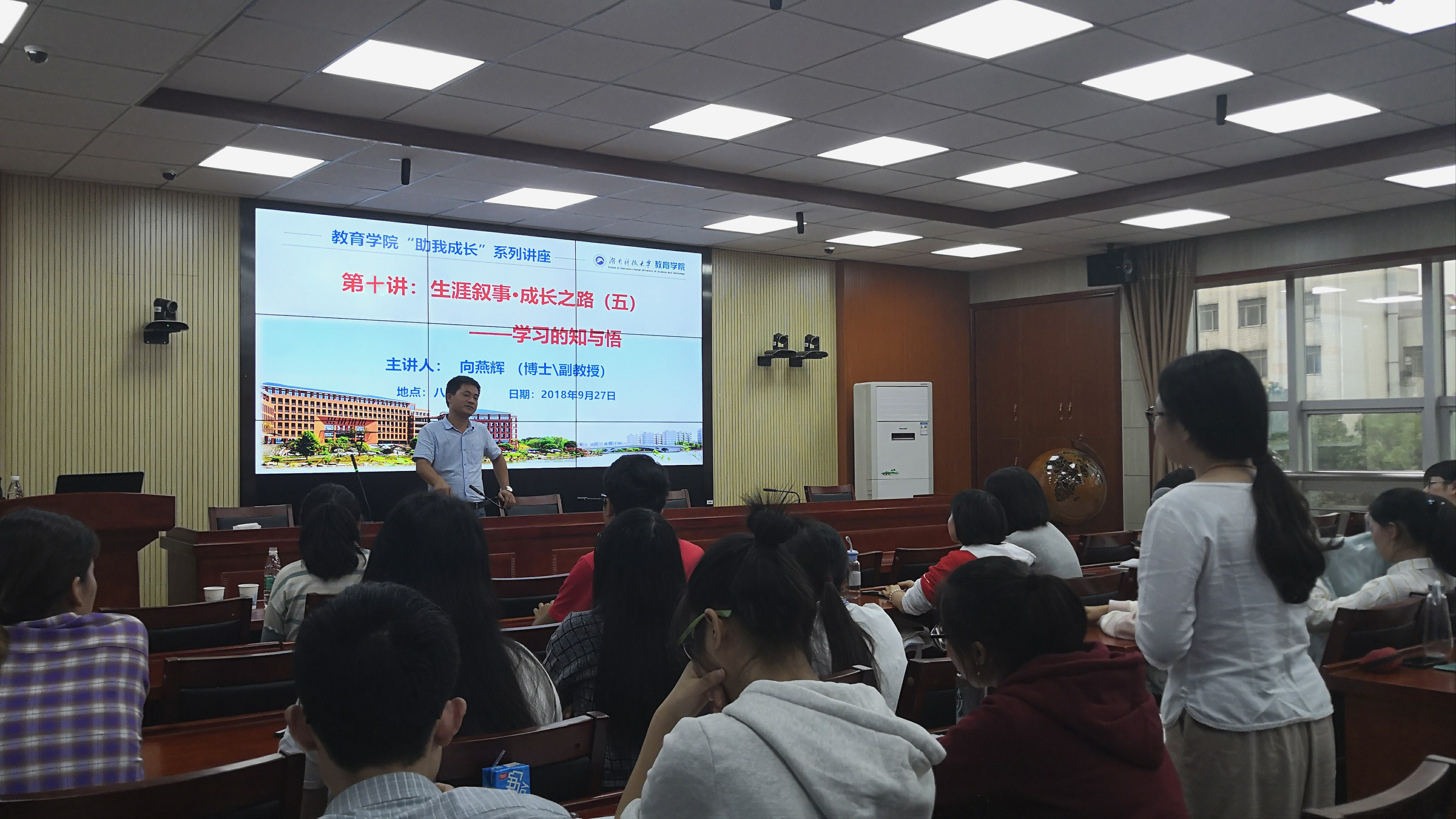 2018年9月27日,教育学院优秀校友2002级应用心理学专业本科生、湖南师范大学心理学系副教授、硕士生导师向燕辉博士莅临我院,在第八教学楼308会议室为我院学生带来“助我成长”系列讲座系列第十讲:生涯叙事﹒成长之路(五)——“学习的知与悟”的讲座。教育学院教师代表、学生代表到场聆听。讲座由教育学院应用心理学系刘志军教授主持。