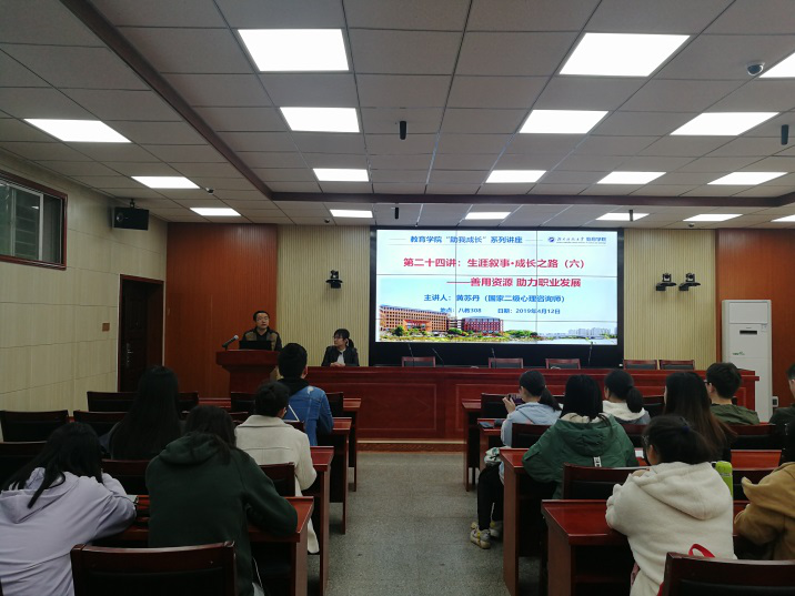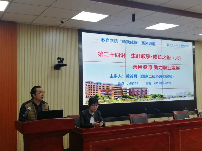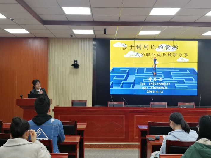 2019年4月12日上午10点,教育学院优秀校友2006级应用心理学专业本科生、2016级硕士研究生、国家二级心理咨询师、郴州市第一人民医院心理科心理咨询师黄苏丹回到母校,在第八教学楼308为我院师生带来“助我成长”系列讲座第二十四讲:生涯叙事· 成长之路(六)——“善用资源 助力职业发展”。教育学院教师代表、学生代表到场聆听。讲座由教育学院党委副书记刘辉亚主持。