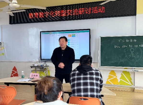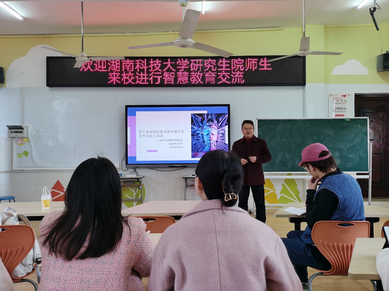 在教育数字化转型的背景下,为助力研究生专业成长,2023年3月30日上午,在湖南太阳成集团tyc122cc入口王伟清教授的带领下,22级现代教育技术、教育技术学、教育管理专业领域的21名硕士研究生深入基础教育一线,来到湘潭市金庭学校,开展以“教育数字化转型交流研讨”为主题的教育见习。金庭学校刘和平校长高度重视此次智慧教育交流活动,对王教授和同学们的到来表示热烈欢迎。