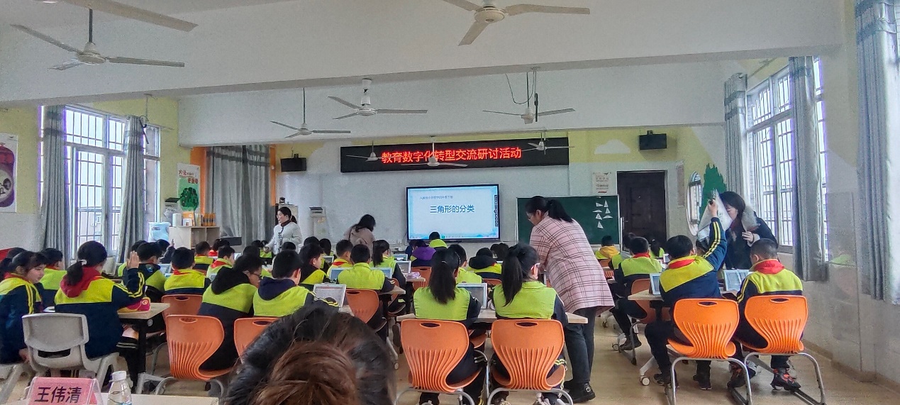 活动议程第二部分,王伟清教授和同学们一起观摩了由金庭学校教师主讲的数学和语文智慧课堂平板教学公开课——《三角形的分类》(郭茜老师)和《红楼春趣》(黄依祎老师)。