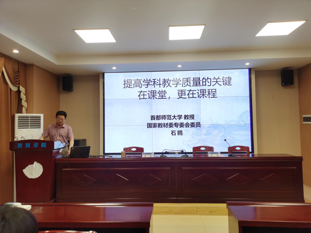 7月16日下午,国家教材委专委会委员、首都师范大学课程教学研究所所长石鸥教授做客“明湖教育论坛”,在敏行楼A333为我院师生带来“提高学科教学质量的关键在课堂,更在课程”的讲座。学院青年教师代表和研究生代表参加,讲座由人文学院李学教授主持。