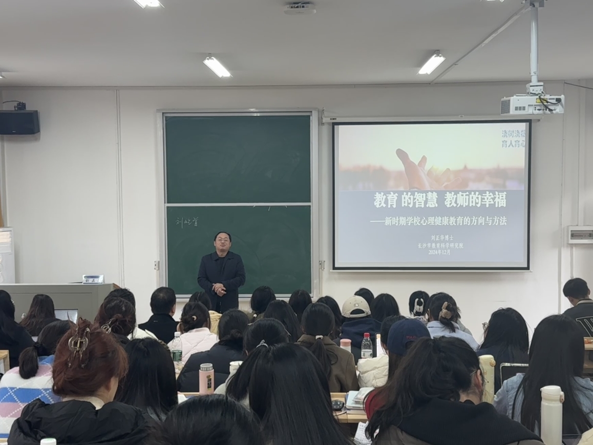 12月18日下午,“名师进研究生课堂”系列讲座第36讲在雨湖校区第二教学楼101教室举行。高级教师,教育博士,长沙市教科院决策研究中心理论教研员刘正华老师为我院师生带来:“教育的智慧,教师的幸福——新时期学校心理健康教育的方向和方法”的主题讲座。我院2024级教育硕士到场聆听,讲座由心理健康教育专业领域导师欧阳益主持。