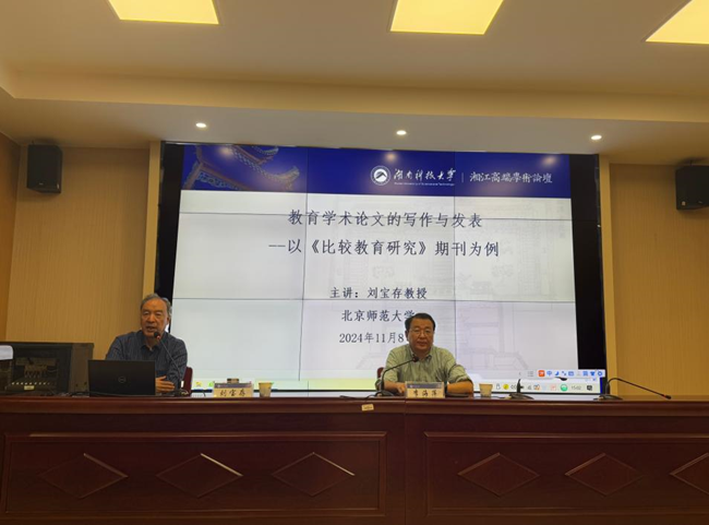 11月8日下午,教育部长江学者特聘教授、北京师范大学国际与比较教育研究院院长、《比较教育研究》副主编刘宝存教授做客“湘江高端学术论坛”,在敏行楼A333为我校师生带来了题为“教育学术论文的写作与发表——以《比较教育研究期刊》为例”的学术讲座。教育学院教师代表和研究生代表参加。讲座由我校研究生院院长、党委研究生工作部部长李海萍教授主持。