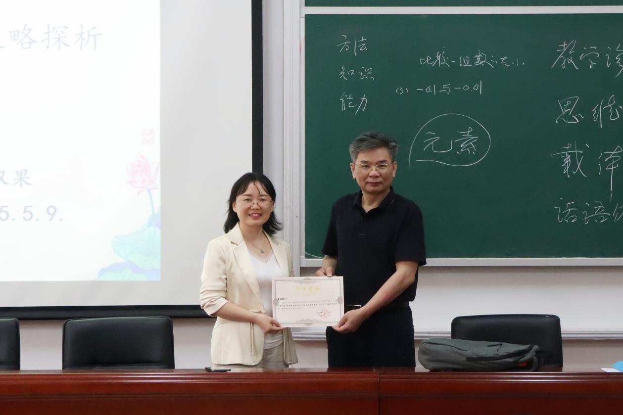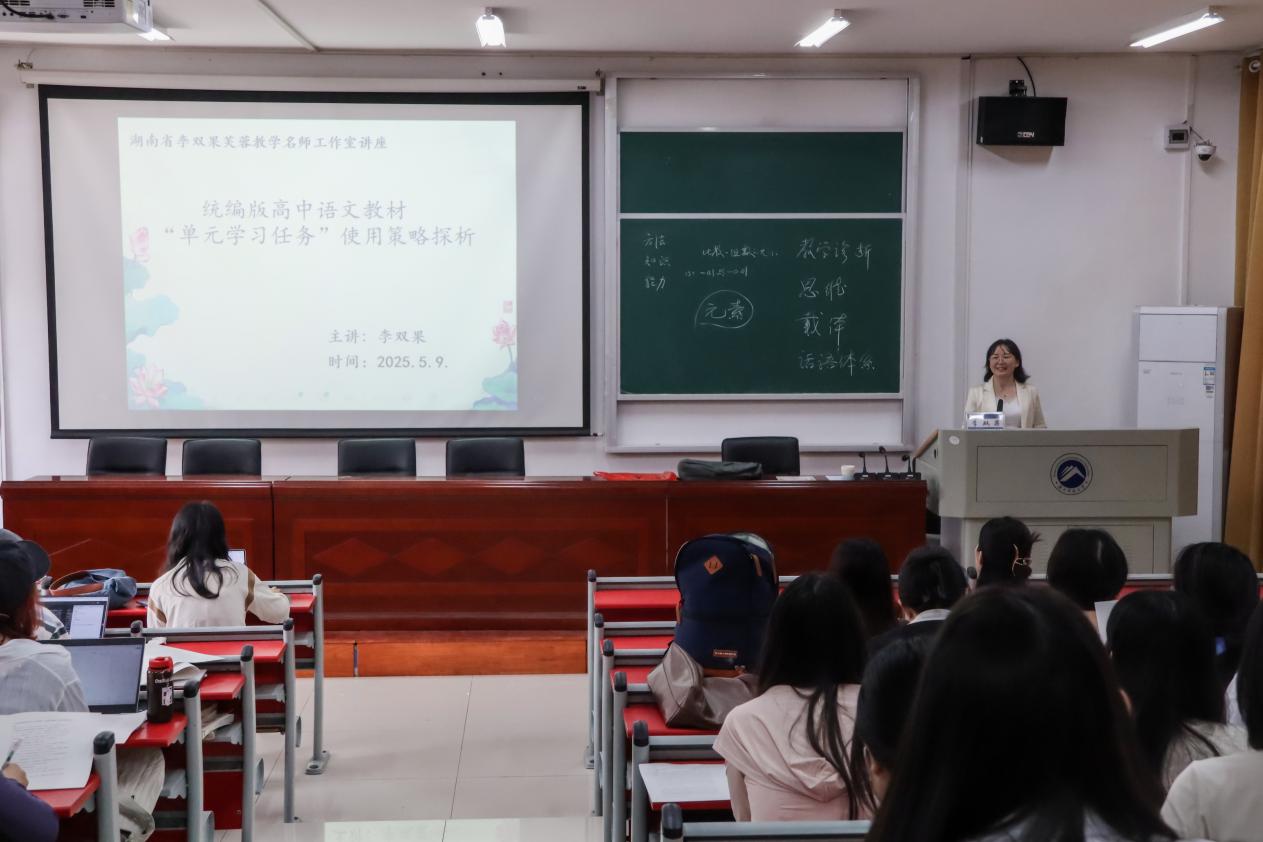 5月9日上午,“名师进研究生课堂”系列讲座第37讲在雨湖校区第二教学楼102教室举行。湖南省芙蓉教学名师、湖南省基础教育精品课评审专家、娄底市高中语文骨干教师、双峰一中“问题导引五环节”教学范式创建核心成员李双果老师为我院师生带来:“高中语文统编教材单元学习任务使用策略探究”主题讲座。我院2024级教育硕士研究生到场聆听,讲座由李炳煌教授主持。