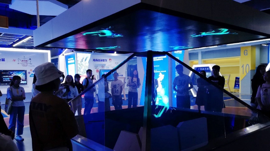 蓝馆中,同学们在工程师讲解与引导下依次参观并体验了3D打印、全息投影、智能语音VR全景单车。同学们纷纷登上沉浸式舞台欢声笑语中体验步步生花、丛林穿越、海底世界等诸多场景17级教技二班的周金利感叹道:“如果虚拟现实和全息投影应用于教学我们的学习内容会更加生动有趣
