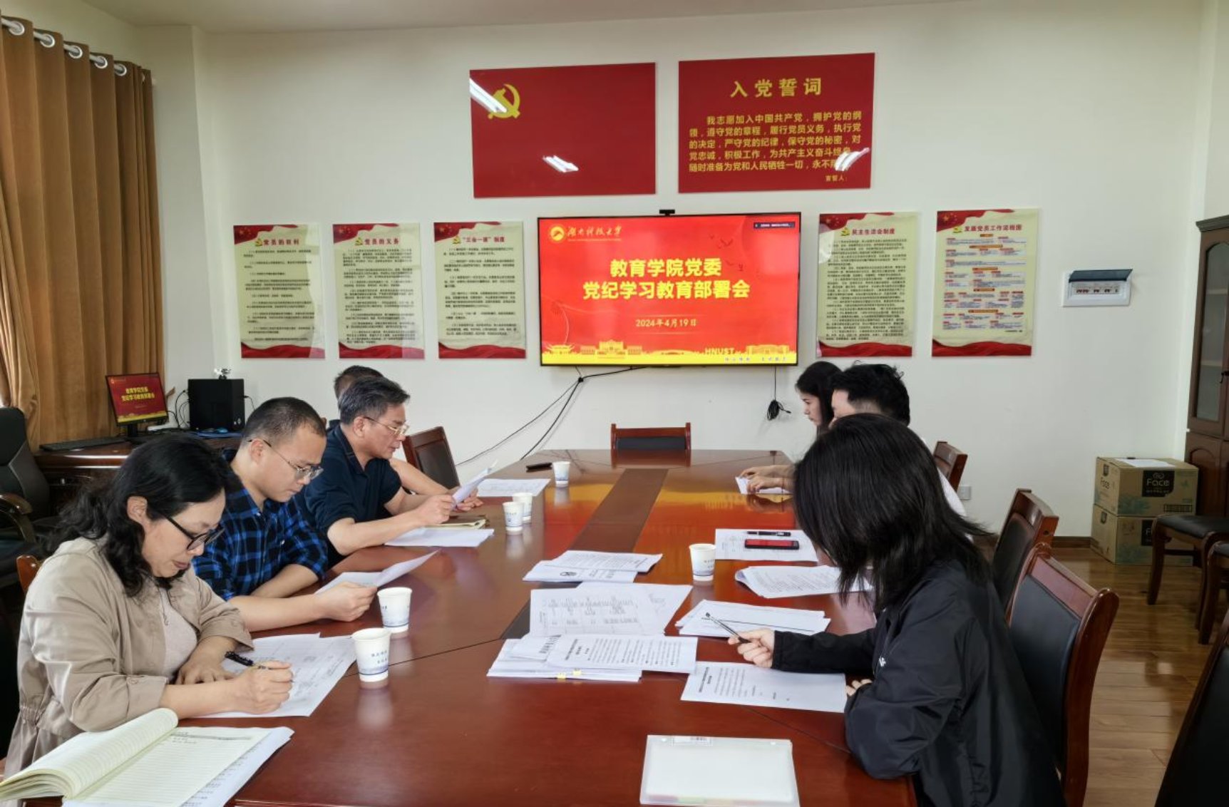李炳煌传达了《中共湖南科技大学委员会关于在全校开展党纪学习教育的实施方案》相关精神。并强调,在全党开展党纪学习教育,是以习近平同志为核心的党中央加强党的纪律建设、推动全面从严治党向纵深发展的重要举措。要深刻领会开展党纪学习教育的重大意义,严格按照学校要求开展党纪学习教育工作,力戒形式主义,党员领导干部带头学、深入学,确保党纪学习教育走深走实。