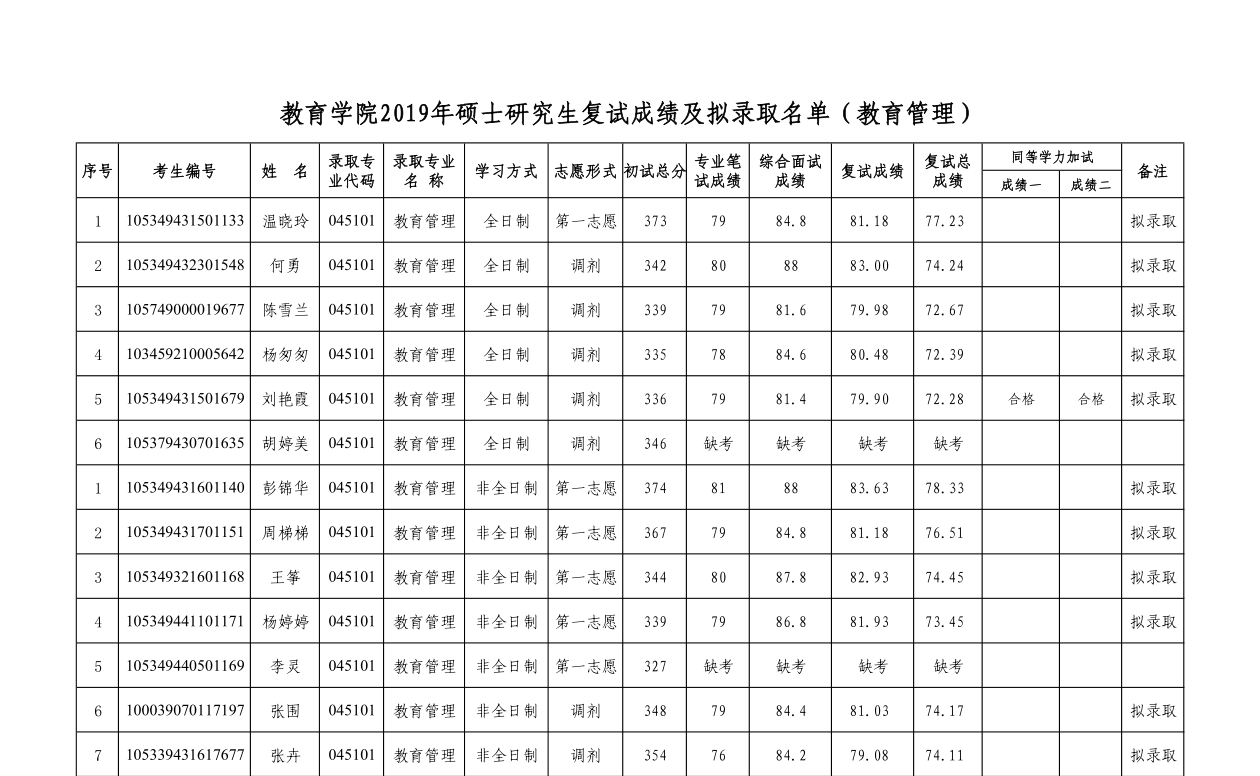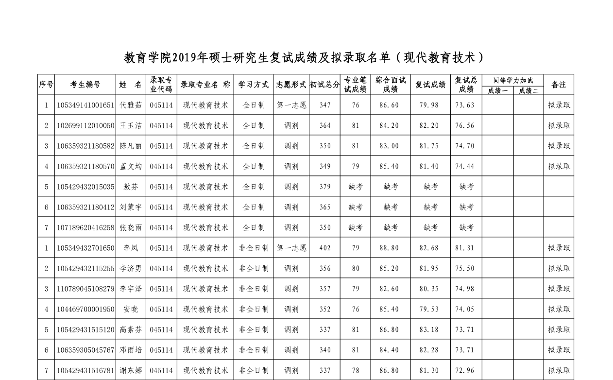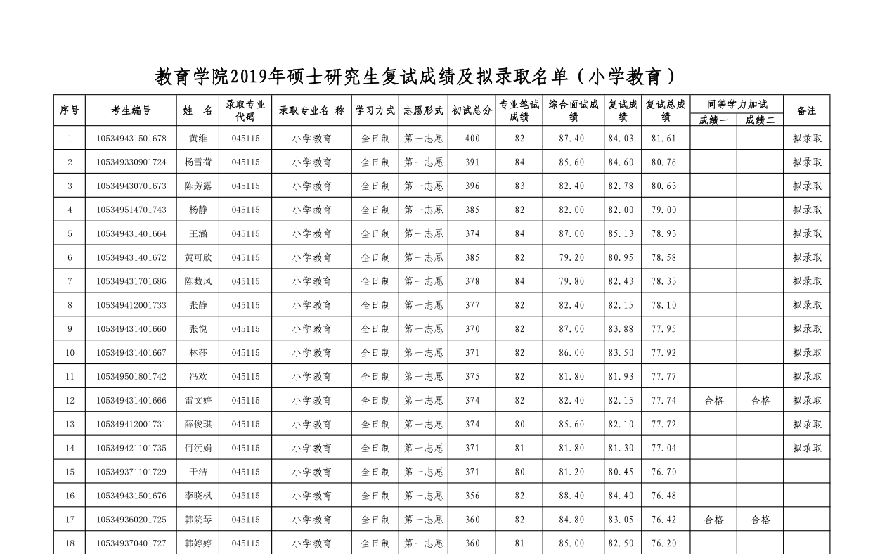教育学院2019年硕士研究生复试成绩及拟录取名单