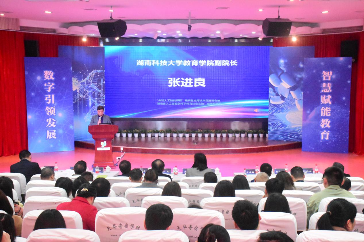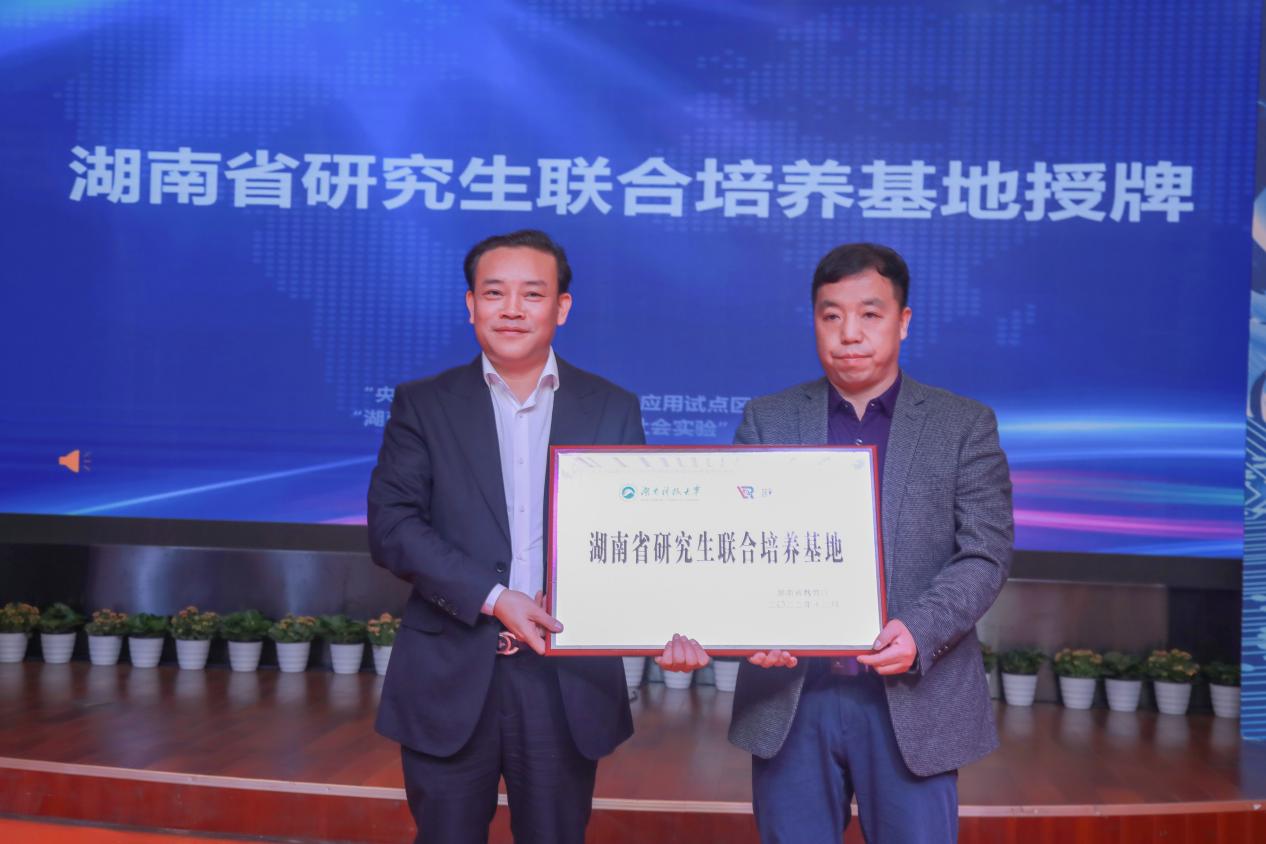 副院长张进良在会上就联合培养研究生、加强校地合作等内容进行了分享交流,他表示将加强与试点区(试点校)合作,选派研究生参与人工智能教育实践,缓解中小学人工智能教育师资不足等问题,为人工智能教育实践提供人力资源支撑。现场还举行了我校湖南威阿智能科技有限公司共建的“湖南省研究生联合培养基地”授牌仪式。