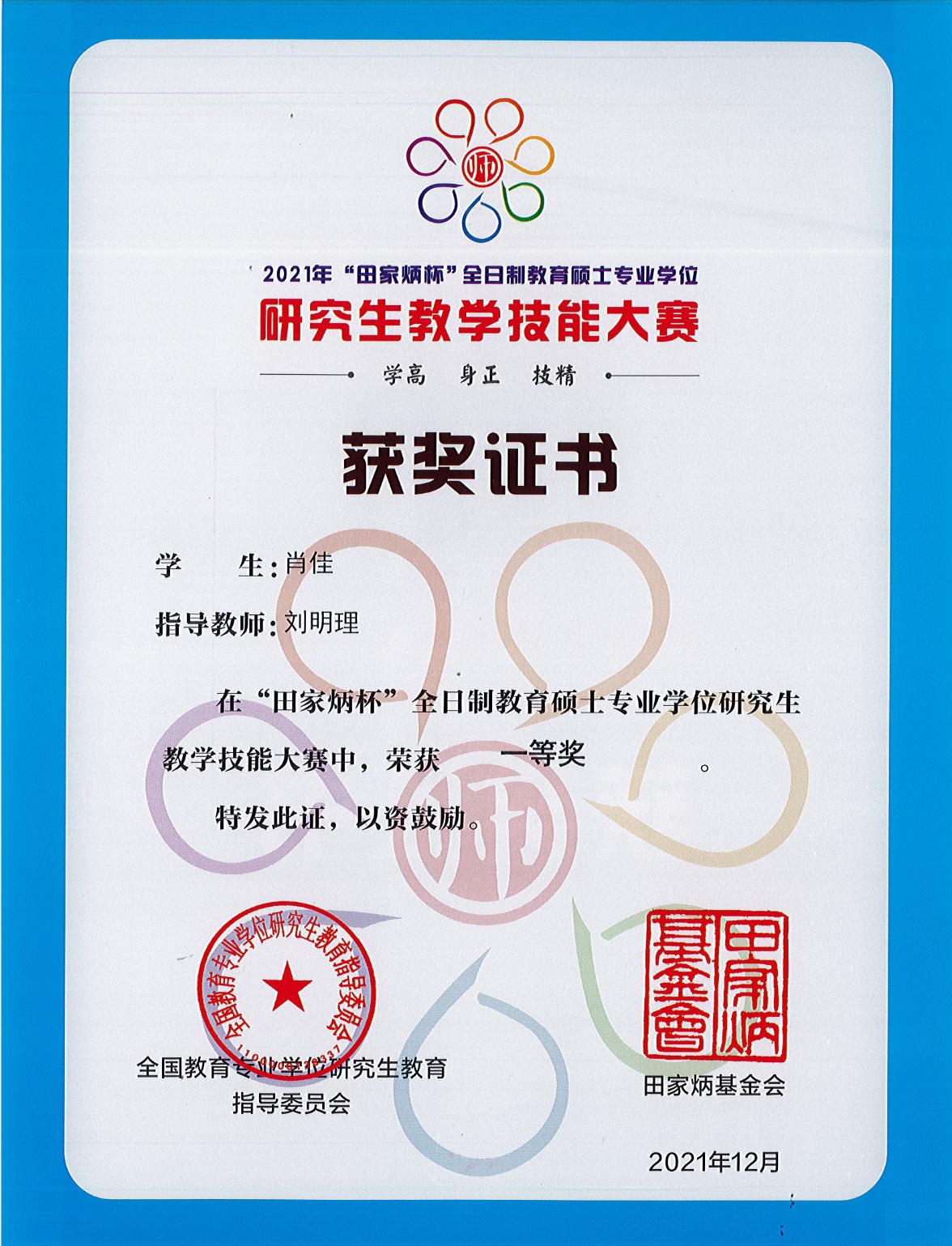 近日,全国教育专业学位研究生教育指导委员会公布了“田家炳杯全日制教育硕士专业学位研究生教学技能大赛获奖名单,我校教育硕士专业学位研究生在本次赛中荣获一等奖二等奖三等奖2项,4老师获优秀指导教师