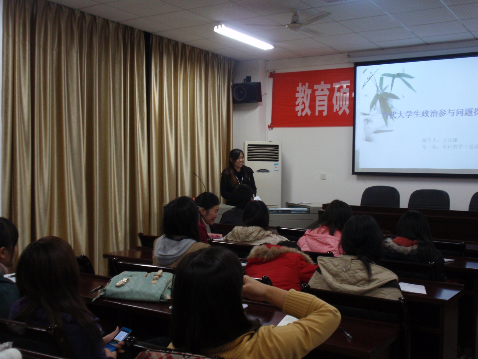 会上,刘妮雅、赵品爱、杨溢、王汝娜四位同学分别以《我国青少年情绪型犯罪的心理成因及其学校干预机制》、《中学综合课程设置的整体观和和谐观探究》、《大学生英语学习策略的调查研究》、《当代大学生政治参与问题探析》为题为大家呈现了一场学术上的饕餮盛宴。刘妮雅通过列举药家鑫案等三个实例来分析十年来我国情绪型犯罪的心理学、教育学研究取向,并从情绪型犯罪概述、情绪型犯罪的心理学研究取向、情绪型犯罪的教育学研究取向、情绪型犯罪的研究展望四个角度进行了详细阐述。赵品爱主要结合《关于综合实践活动课程的理性审视》和《综合实践活动课程的整体性探究》这两个研究成果对综合实践活动进行了深入探讨。杨溢则从语言学习策略的内涵、学习策略的分类、具体教学模式的三个角度呈现了其研究成果。王汝娜对当代大学生政治参与现状做出了详细的分析,总结出了影响因素并提出了有效对策。会场气氛热烈活跃,学生提问及讨论环节更是一次次撞击出思想的火花。