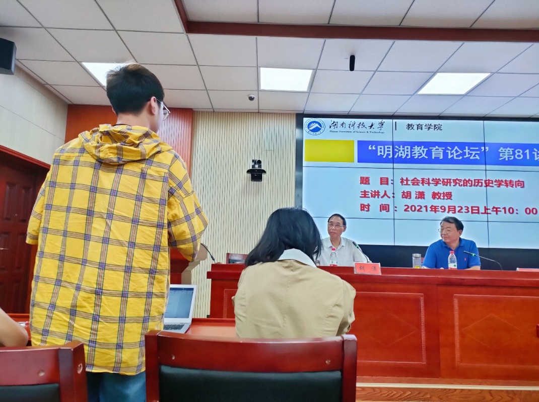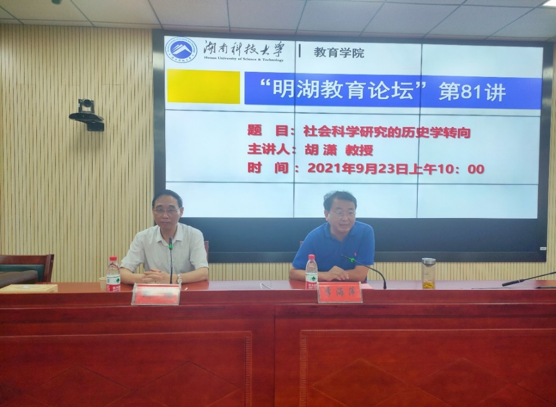 9月23日上午,广州大学教授、中山大学兼职博导胡潇教授做客“明湖教育论坛”,在第八教学楼308学术报告厅为我院师生带来了题为《社会科学研究的历史学转向》的学术报告。报告由教育学院院长李海萍主持,教育学院教师、研究生代表到场聆听。