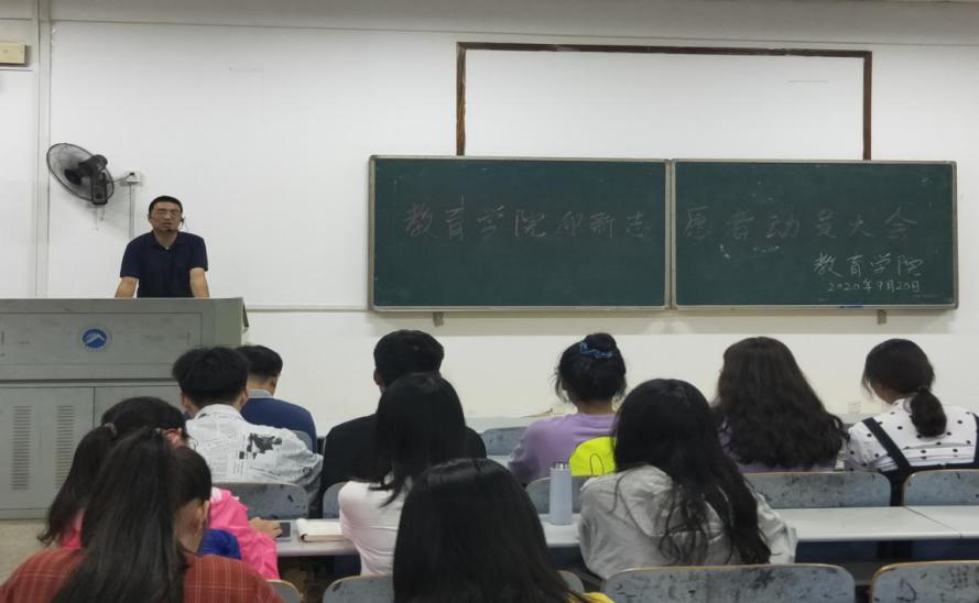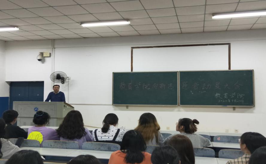 9月20日晚上7:30,为保证新学期迎新工作的顺利进行,教育学院在第八教学楼3-3教室召开迎新志愿者动员大会。此次会议由学工办主任李涛主持,院党委副书记刘辉亚出席会议,教育学院全体迎新志愿者与会。
