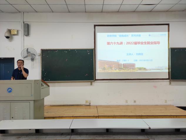 为应对当前紧张的就业形势,加强对毕业生就业的指导与帮助,提高我院2022届毕业生的就业意识,教育学院于9月11日下午2:50在第八教学楼1-3教室开展了“助我成长”系列讲座第六十九讲——2022届毕业生就业指导会。会议由院党委副书记刘辉亚主讲,2022届毕业生们到场聆听。