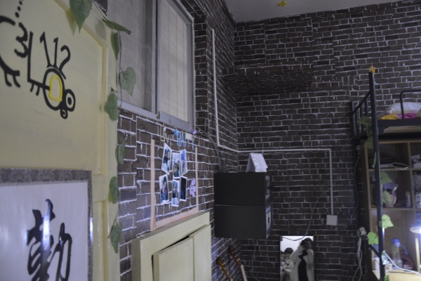 显然,同学们都对自己的宿舍进行过精心设计,素雅的墙纸,漂亮的床帘,精致的小饰品将宿舍装扮的简洁大方、清新典雅,弥漫着书香气息;还有的宿舍贴上了寝室成员大合照、心愿、祝福,再配上宿舍温馨的装扮,给人带来家的温暖。除此之外,精美的室徽,严谨的寝室公约也是此次寝室文化节的一大亮点。贴纸,彩帘,气球等饰物令人仿若置身晚会现场,而别具一格的留言板,卫生角,记忆墙等细节也让人眼前一亮,更有女生用心折出来的千纸鹤,纸星星点缀其间,尽显准备之精心。其中涌现出许多不俗之作,譬如女生宿舍112匠心独运地用酷似墙砖的壁纸营造出浓浓的复古风情,配合恰到好处的几种乐器,自成一家,获得了滕老师及团委学生会干部的一致好评。而男生宿舍411则另辟蹊径,在一片贴纸的海洋中举起了剪纸的大旗,自信地向滕老师及各干部介绍着纯手工制作的,以大型钢琴剪纸为主体的一系列繁复的剪纸作品。其真诚给人留下了深刻的印象。同学们的设计作品百花争妍,各有千秋。尽显院学子卓越的设计才华和过人的艺术素养,着实令滕老师惊叹不已。