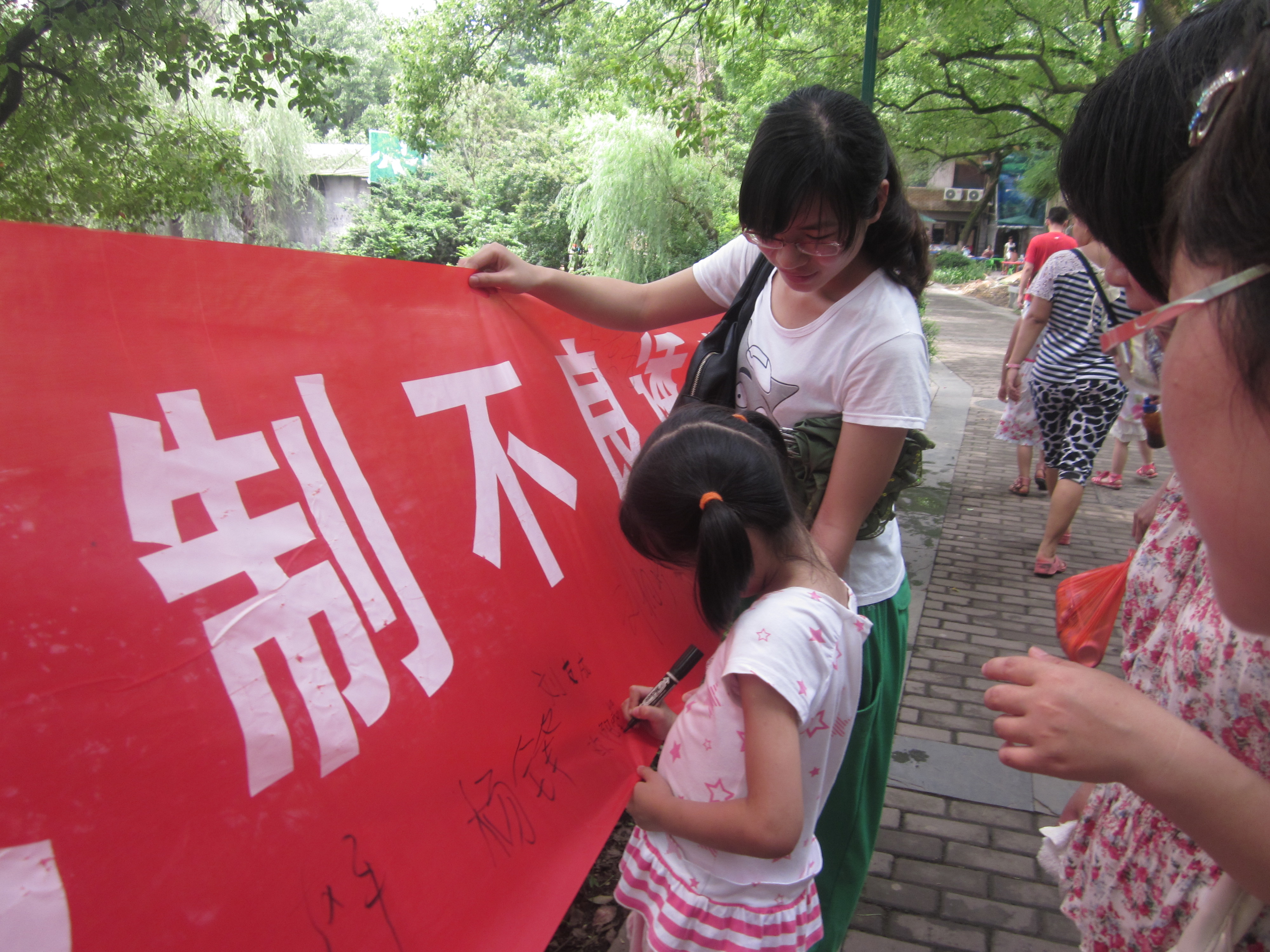 在雨湖公园,甚至连穿着笔挺西装的白领也停下了脚步,不少爷爷奶奶、爸爸妈妈也围了上来。“你们的活动除了在公园跟家长孩子互动外,最好还能走进校园跟老师进行互动,两架马车跑得更快啊!”一位老奶奶建议说。队员们赶紧跟奶奶说明,这是一个系列活动,横幅签名只是其中环节之一,“奶奶你放心,我们的活动不仅是面向家长、学生的,也是面对学校和社会的,还不只三驾马车呢!”队员们落下话音,老老少少相视大笑起来。