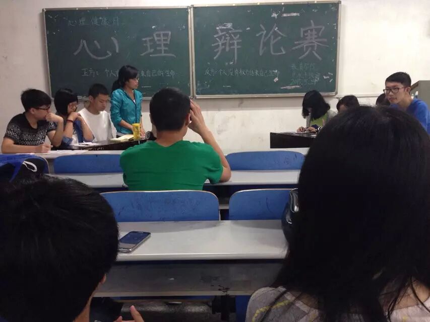 2015年5月24日15:00,教育学院危机干预部积极响应校心健“心理健康月”活动,就“个人有没有权利结束自己的生命”为辩题,于第八教学楼1-6举开展辩论赛。辩论赛开头由主持人简单介绍此次辩论赛力图促进同学们“珍爱生命”的目的,并宣布辩论赛正式开始、邀请双方辩手入场就坐。