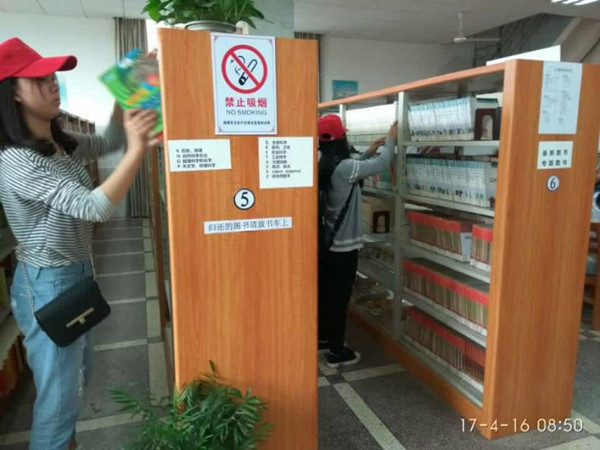 为了让志愿者充分感受图书馆工作人员的艰辛,鼓励大学生养成良好的图书借阅习惯,方便市民找到自己需要的书籍,教育学院青年第十四届青年志愿团第一中队和第六中队志愿者于4月16日上午前往湘潭市图书馆和湘潭市少年儿童图书馆整理图书,在浓郁的书香中,开始他们最后一次的志愿服务。
