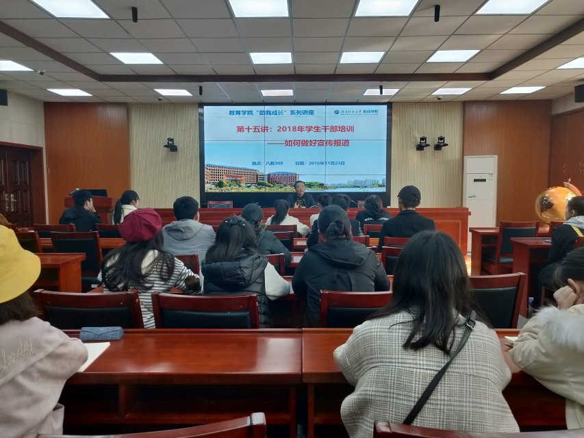 为提高各部门同学新闻稿写作的质量,进一步推动学院宣传报道工作的开展,2018年11月23日14:00,由教育学院团委学生会宣传网络部主办的新闻培训大会于第八教学楼308成功举行。出席会议的有教育学院党委副书记刘辉亚、团委学生会副主席曾根凤、第十九届团委学生会宣传编辑部部长蒋奔奔,学生会各部门成员参与本次大会。