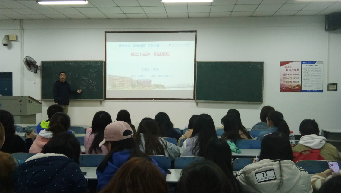 为帮助18级同学更好地理解职业规划,顺利开展职业规划大赛,2019年4月2日下午4:00,教育学院在第八教学楼2-3开展了由学工办主任李涛主讲的“助我成长”系列讲座第二十三讲:职业规划。18级全体本科生到场参加讲座。